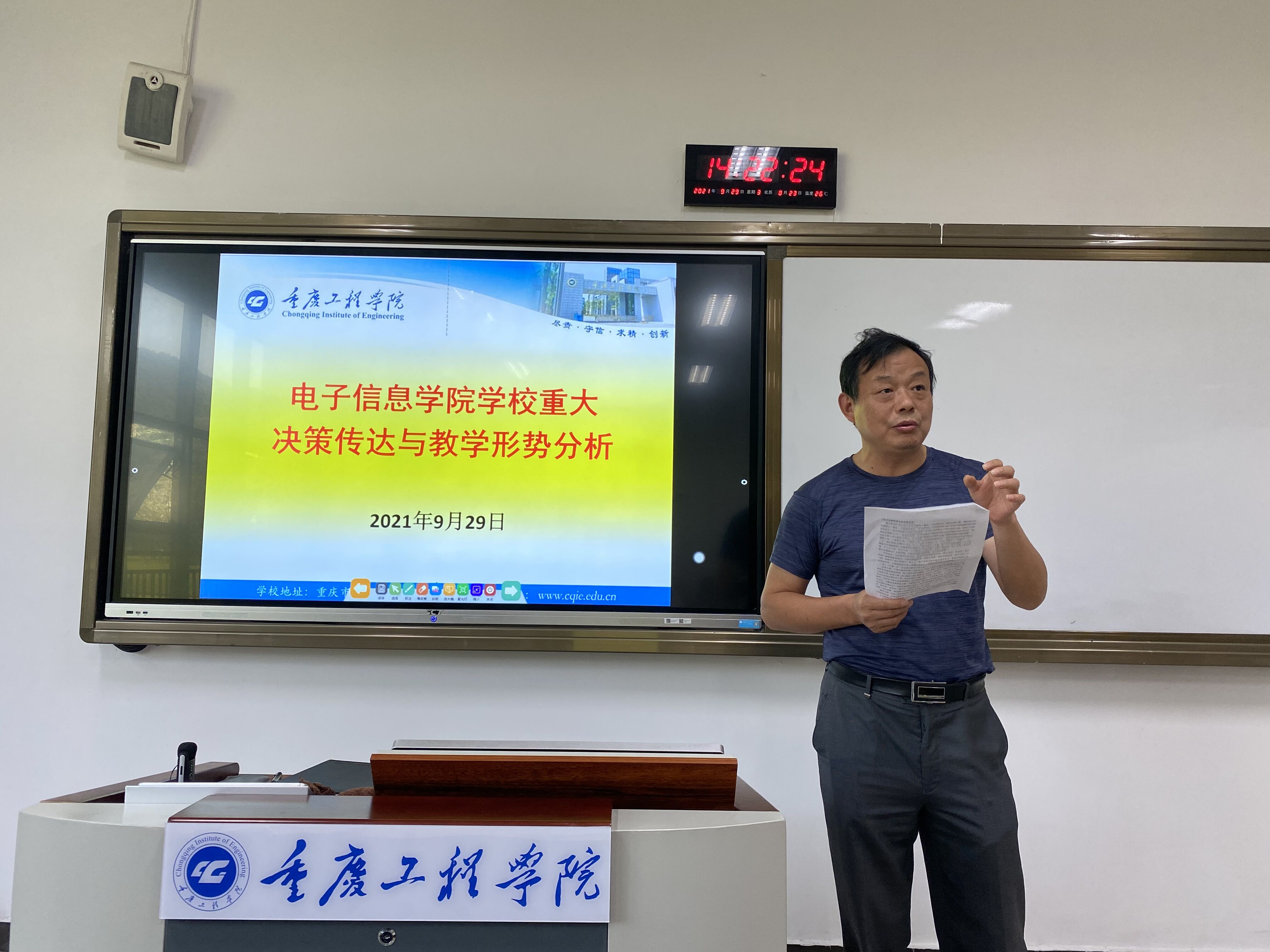 2021年9月29日,电子信息学院在第六教学楼103室召开关于学校重大决策传达与教学形势分析会,会议由何世彪院长主持,全院教职工参加。
