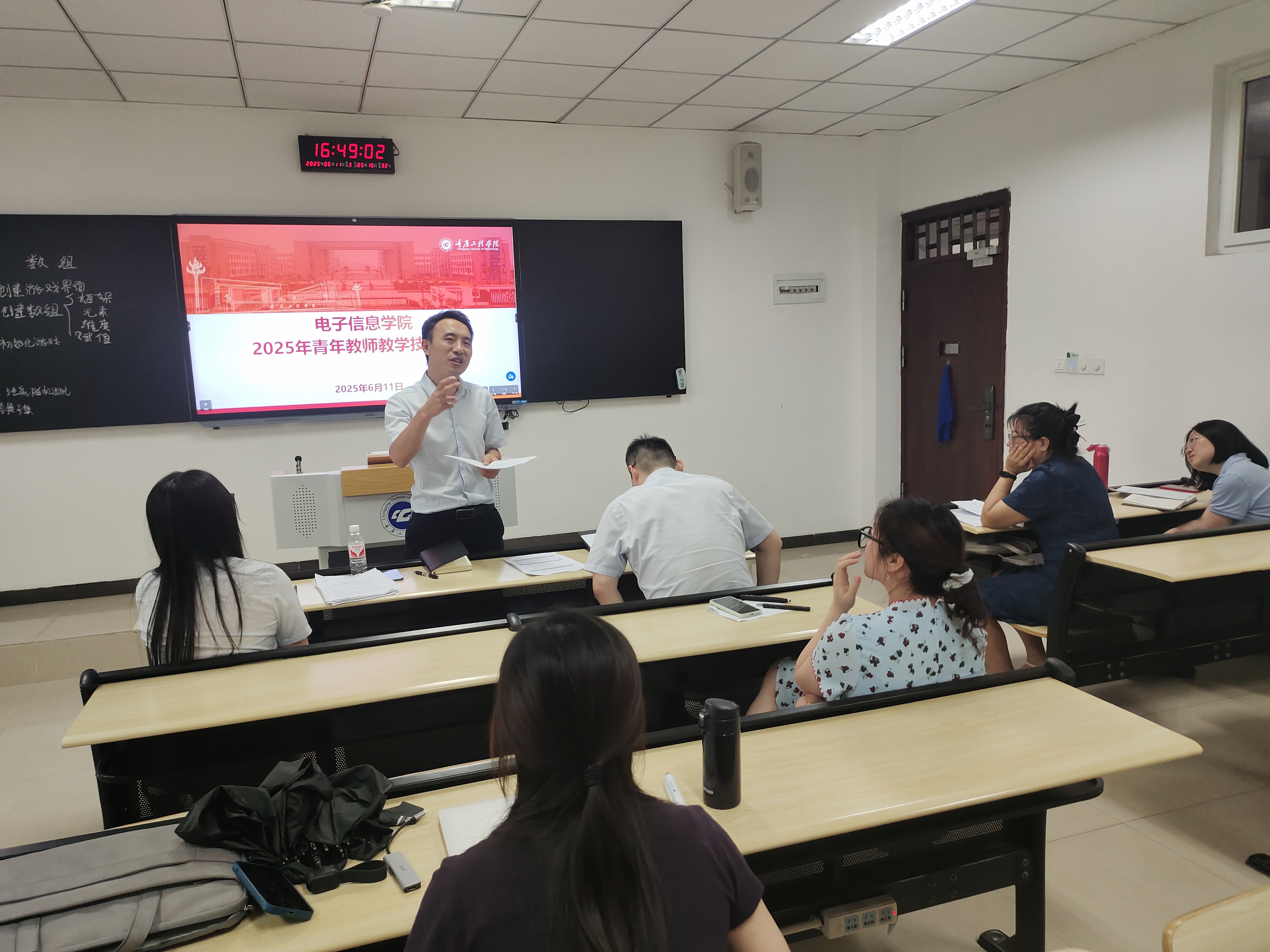 为推动青年教师更新教学理念,创新教学方法,提升教学技能,注重培养学生能力,实现以赛促教、以赛促学、以赛促发展的目标,6月11日16时,电子信息学院在六教210开展了青年教师教学技能比赛。副院长景兴红、院长助理张仁永、系主任张冬雪、陈印、校督导杨剑利担任本次比赛评委。学院部分老师参加本次活动。