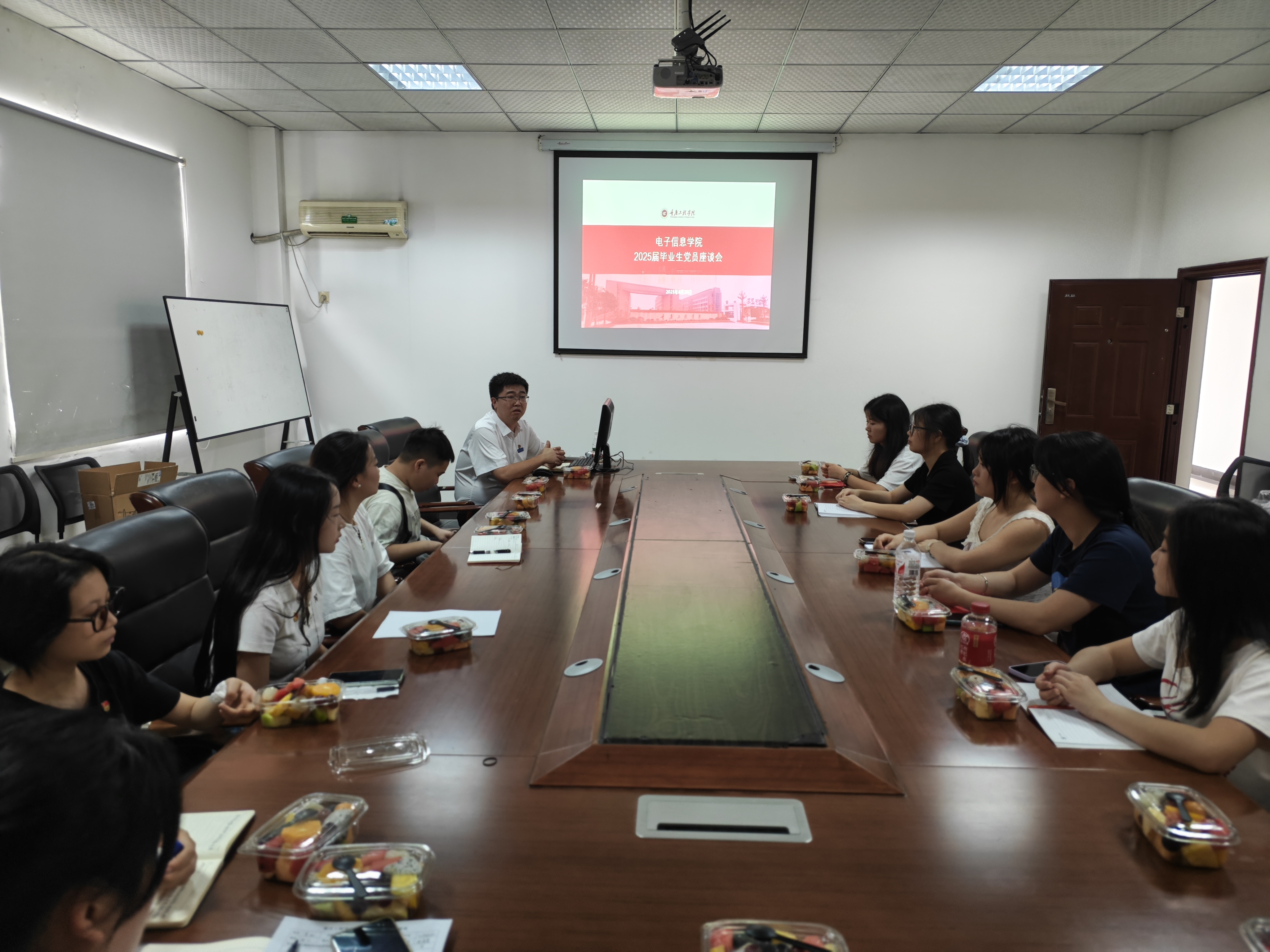 2025 年 6 月 20 日,电子信息学院在办公楼 401 会议室召开 2025 届毕业生党员座谈会。学院党总支书记谭思宇同志与全体毕业生党员齐聚一堂,共同上好毕业前的最后一堂党课,为即将踏上新征程的党员学子筑牢思想根基、明晰使命担当。