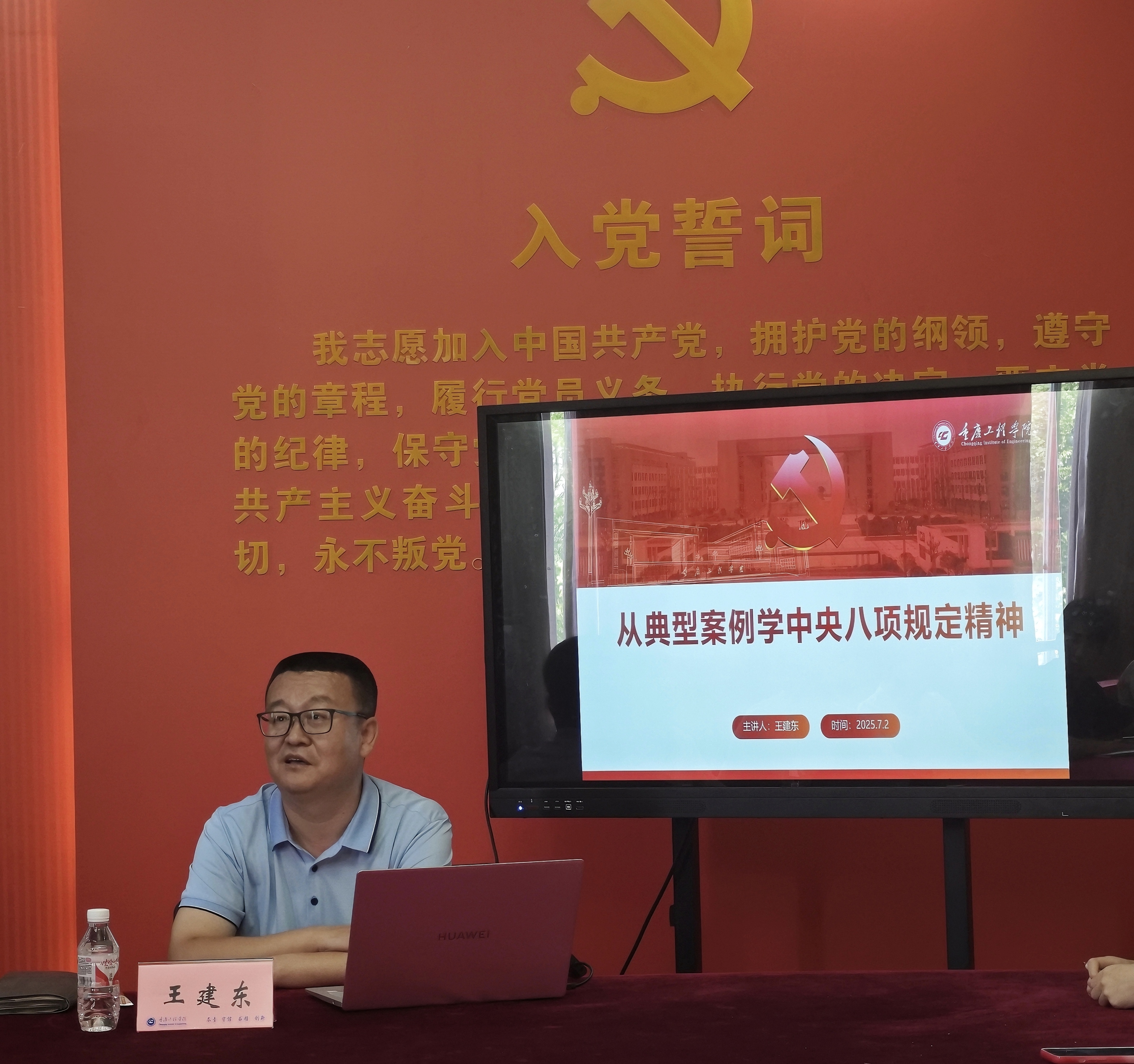 会上, 王建东副校长紧密结合工作实际,选取具有代表性的反面典型案例,深入剖析了违反中央八项规定精神问题的具体表现、思想根源及严重危害。他系统阐释了中央八项规定精神的深刻内涵、核心要义及新时代新征程上持续深化落实的重大意义。王建东同志强调,全体党员必须时刻保持清醒头脑,筑牢思想防线,自觉将中央八项规定精神内化于心、外化于行,做到知敬畏、存戒惧、守底线,以优良党风带动校风学风持续向好。