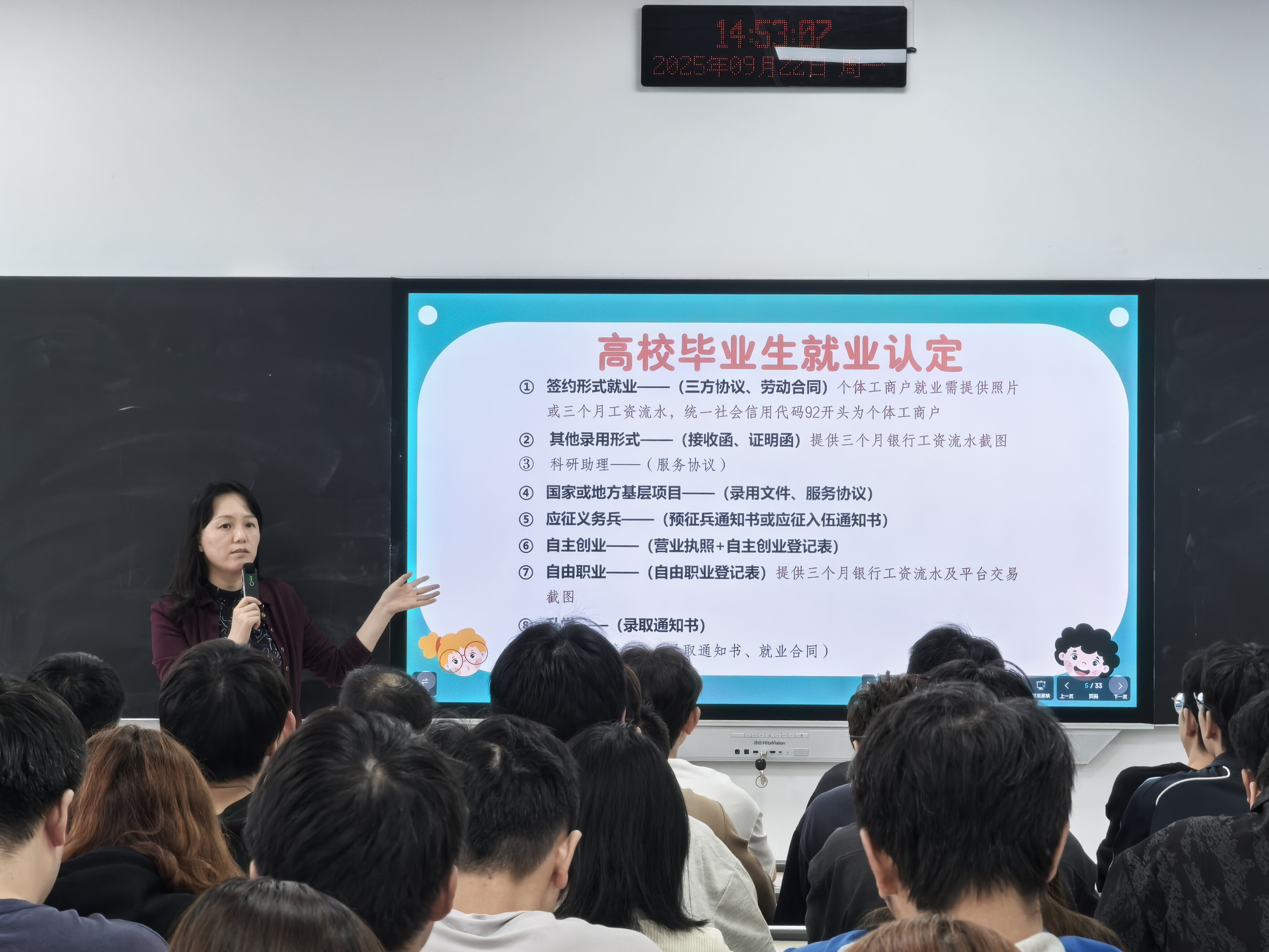 为进一步提升学生就业竞争力,助力毕业生顺利走向职场,电子信息学院就业科副科长卢瑛于 9 月 22 日下午,在双桥校区为 26 届毕业生举办了以“大学生求职策略与职业素养提升”为主题的就业指导讲座,共 120 多名学生参加。讲座围绕求职准备、面试技巧、职业素养培养及常见就业问题答疑等内容展开,为同学们提供了系统、实用的就业指导。