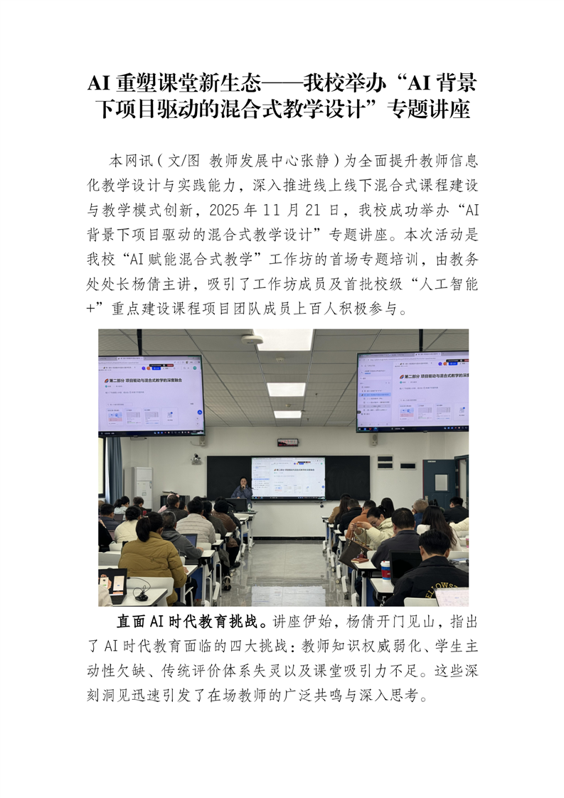 AI重塑课堂新生态——我校举办“AI背景下项目驱动的混合式教学设计”专题讲座