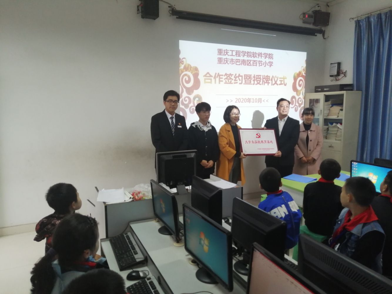本网讯(文/杨昊东 图/余仁俊)为引导大学生自觉走与实践相结合的成才之路,帮助大学生在实践中受教育、长才干、做贡献,培养高素质应用型人才,同时也为百节小学提供对应课程的师资资源,经过前期深入对接和沟通,2020年10月28日下午,软件学院与巴南区百节小学举行大学生社会实践基地签约暨授牌仪式。 仪式上百节小学田校长发表了讲话,非常感谢并欢迎同学们的到来,并希望小学生们在大学生老师的帮助下,能够学有所成、学习进步。随后双方进行了实践教育基地签约和授牌环节。学院党总支刘子菱书记也做了讲话,感谢百节小学提供的平台,希望同学们能珍惜这样的实践机会,认真备学情、备内容、备方法,祝福小学生能够快乐学习、健康成长。 授牌仪式结束后,党员实践教育中心“红心支教团”同学进行了第三次授课。