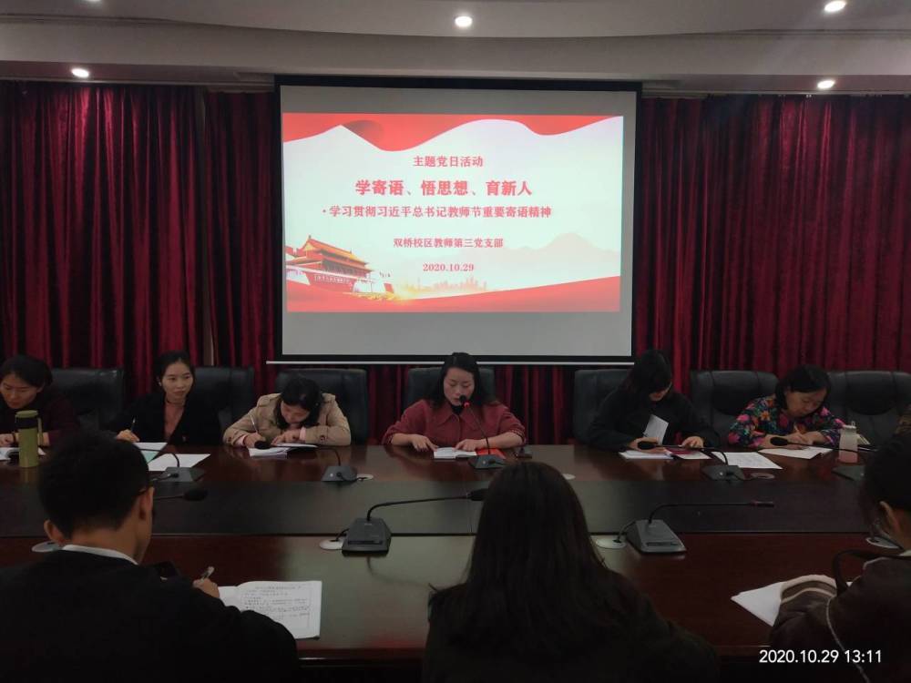 10月29日下午,双桥校区教师第三党支部在南泉校区老行政楼第二会议室开展了“学寄语、悟思想、育新人”为主题的主题党日活动。党员同志对习近平总书记教师节重要寄语精神进行了学习和讨论。大家一致表示,要不忘初心、牢记使命,坚持立德树人、为党育人、为国育才,做锤炼学生品格的引路人、做学生学习知识的引路人、做学生创新思维的领路人、做学生奉献祖国的引路人。