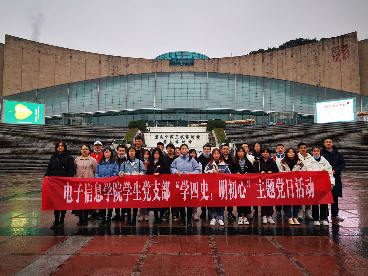 读史使人明志,鉴以往而知未来,滋养初心使命,强化责任担当。12月6日上午,电子信息学院学生党支部开展“学四史,明初心”主题党日活动,学生支部书记宋文轩老师和组织委员郭晓伟老师带领支部在校党员一同前往三峡博物馆参观学习。跟随每个展区的自动讲解,从远古巴渝到城市之路,党员们重温了三峡人传承历史、创造文明的精神。特别是抗战岁月展厅,通过现代化科技手段向我们展示老一辈共产党人在那段艰难岁月中的光辉事迹。参观结束之后,党员们震撼不已,流连忘返,本次活动加强了党员同志对学“四史”、知“四史”、明“四史”,守初心、勇担新时代责任与使命的认识。