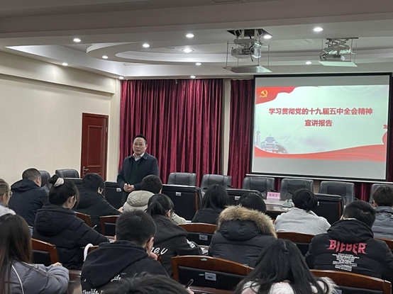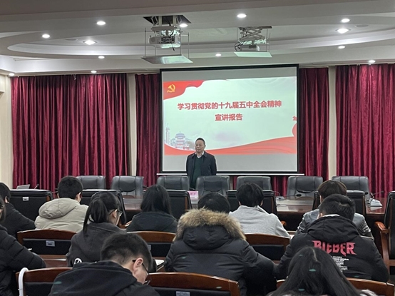 本次党课由校党委书记谭明术同志和部分党性分子参与。课上,谭书记结合十九届五中全会精神向同志们讲述了十九届五中全会的基本情况,并从中华民族伟大复兴的历史进程中,全面把握新发展阶段的新机遇、新挑战。