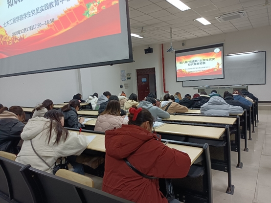 为深入贯彻学习党的十九届五中全会精神,扎实开展抗美援朝、改革开放主题教育活动。土木工程学院于2020年12月17日17:50—18:50在第六教学楼202、203、301、304教室举办第六届“党史杯”大学生党史知识竞赛。土木工程学院全体入党积极分子、发展对象、预备党员以及在校党员参加此次竞赛。