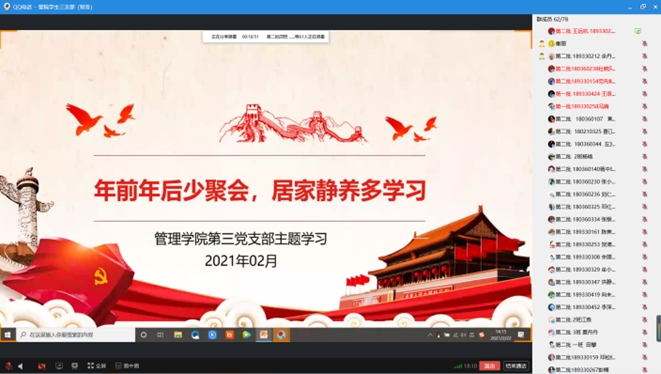 2021年2月22日14:00分,管理学院学生第三党支部在线上开展了“年前年后少聚集,居家静养多学习”主题学习活动,参加本次学习活动的有管理学院学生第三党支部的党小组全体成员。此次主题学习活动由党小组组长王远杭同志主讲。