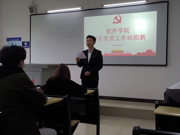 2021年3月22日12:30,软件学院学生党员实践教育中心在6120、6122教室进行了软件学院学生党员工作站的招新面试。党总支组织员黄梅老师、学生第二党支部组织委员李霜老师等6位评委同志出席了本次招新会,参与面试的同志共12人。