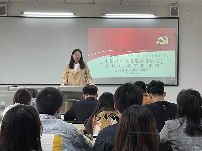 为加强和改进党对普通高等学校的领导,进一步的加深高等学校党的建设,办好中国特色社会主义大学,为高等教育事业的科学发展提供思想保证、政治保证和组织保证。提高和巩固党员的政治理论基础,激发党员同志的奋进力量。土木工程学院学生第一党支部于2021年5月6日15:50—16:20在第六教学楼223教室开展“学习基层组织条例工作”支部党员大会,此次会议由土木工程学院学生第一党支部书记肖思同志主持,土木工程学院学生第一党支部在校全体党员参与此次大会学习。
