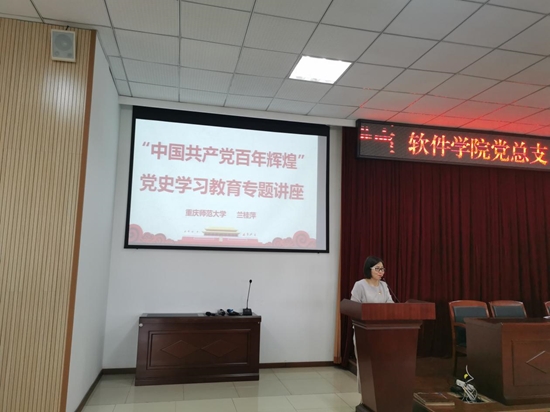 为深入开展党史学习教育,从百年党史中汲取前进智慧和力量,积极引导全体师生党员学史明理、学史增信、学史崇德、学史力行。5月8日下午,软件学院党总支邀请重庆师范大学兰桂萍副教授在6302报告厅为大家做“中国共产党百年辉煌”党史学习教育专题讲座。讲座由软件学院党总支书记刘子菱主持。