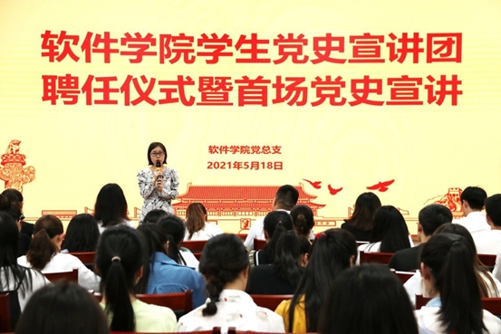 在庆祝中国共产党成立100周年之际,软件学院党总支组建了“学生党史宣讲团”,从青年学生视角出发,深入校园、社区开展党史宣讲,讲好党的百年辉煌故事。5月18日下午,“软件学院学生党史宣讲团聘任仪式暨首场党史宣讲”在新办公楼201会议室举行。软件学院党总支书记刘子菱出席了仪式,学院学生党支部发展对象、党员及党史宣讲团成员共百余人参加活动。