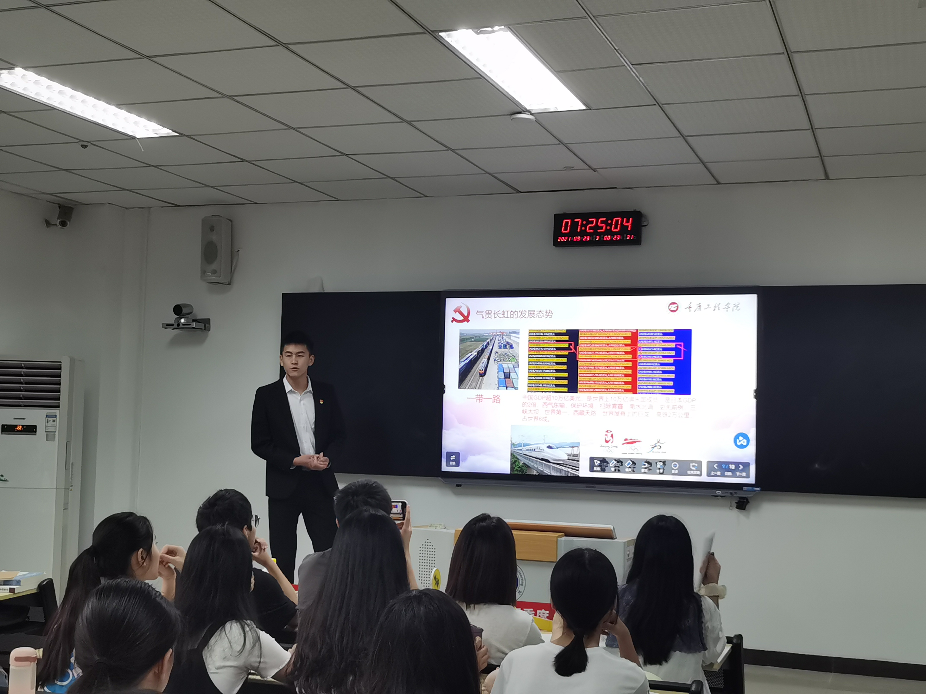 为庆祝伟大祖国72周年华诞,弘扬爱国主义精神和集体主义精神,讴歌社会主义的美好生活,展现重工学子的精神风貌,2021年9月29日,管理学院学生党支部在第六教学楼开展了以“盛世迎国庆”为主题的“大学生微党课”进班级活动。8位2019级预备党员走进晨课教室,为2020级同学们进行宣讲。