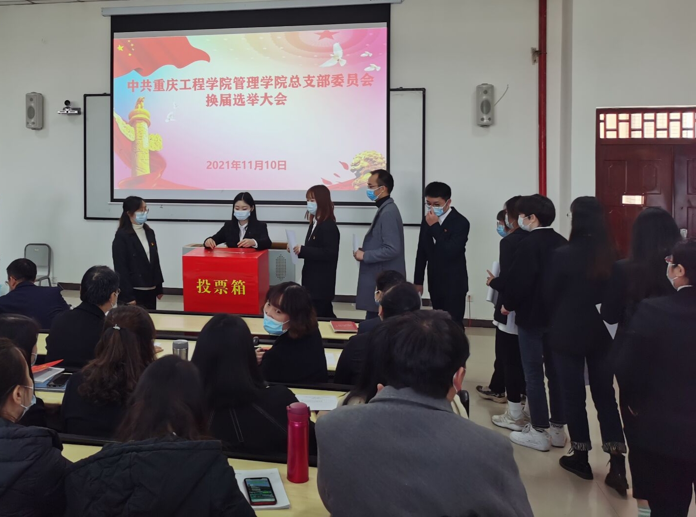 会议伊始,荣菁菁同志介绍了大会流程。首先,管理学院党总支本届总支书记刘达斌同志对我院党总支上一届总支委员会工作情况进行了汇报,内容涉及工作成绩、存在不足、学院党组织建设下一步努力方向等方面,强调全体党员要坚持理想信念,加强党组织规范化、标准化建设。接着,校党委委员、校长助理王建东同志宣读了校党委《关于同意管理学院党总支召开换届选举大会的批复》。随后,全体党员一致通过了大会选举办法和监票人名单,并进入大会选举环节。本次委员候选人9名,应选7名,差额2名。大会采取无记名投票方式,差额选举产生了由王燕楠、刘达斌、李玲、周小波、荣菁菁、彭建仿、曾艳灵7名同志组成的新一届总支委员会;并经新一届总支委员会第一次全体会议,等额选举出了党总支书记刘达斌,副书记彭建仿、李玲,同时明确了其他委员分工。会上,与会党员也共同观看了党史学习视频。