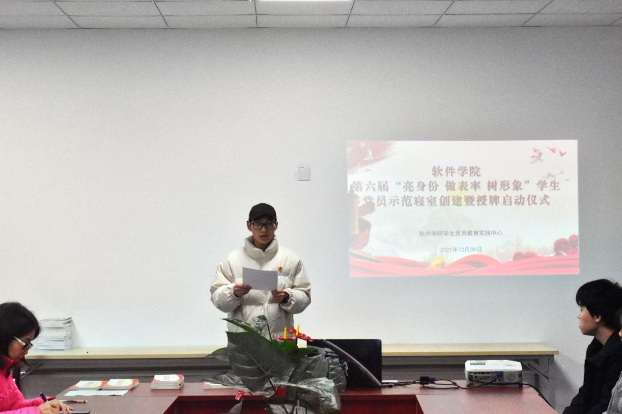 为深入推进“六带头,六表率”教育实践活动,充分发挥党员先锋模范作用,2021年12月9日下午,软件学院开展学生党员示范寝室授牌仪式。软件学院党总支书记刘子菱、学生党支部书记王薇、余巧、王芳和学生党员参加了此次活动。