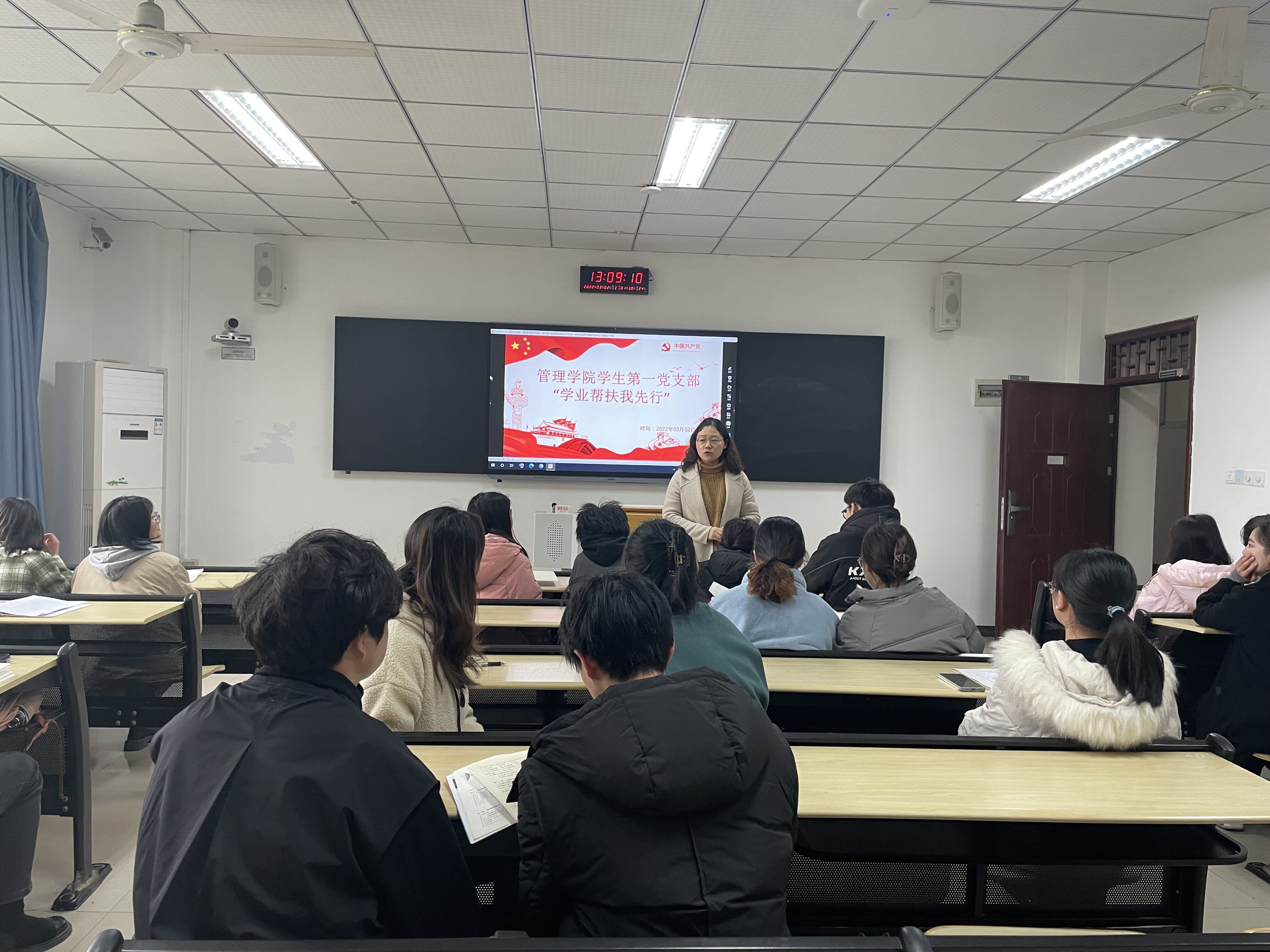 为弘扬雷锋精神,鼓励党员同志积极帮助在学习上有困难的同学,尤其是即将参加期初补考的同学,2022年3月2日下午,管理学院学生第一党支部在6208教室举行了“学业帮扶我先行”活动。管理学院学生第一党支部书记宋曼以及15名学生预备党员、发展对象参与了此次活动。