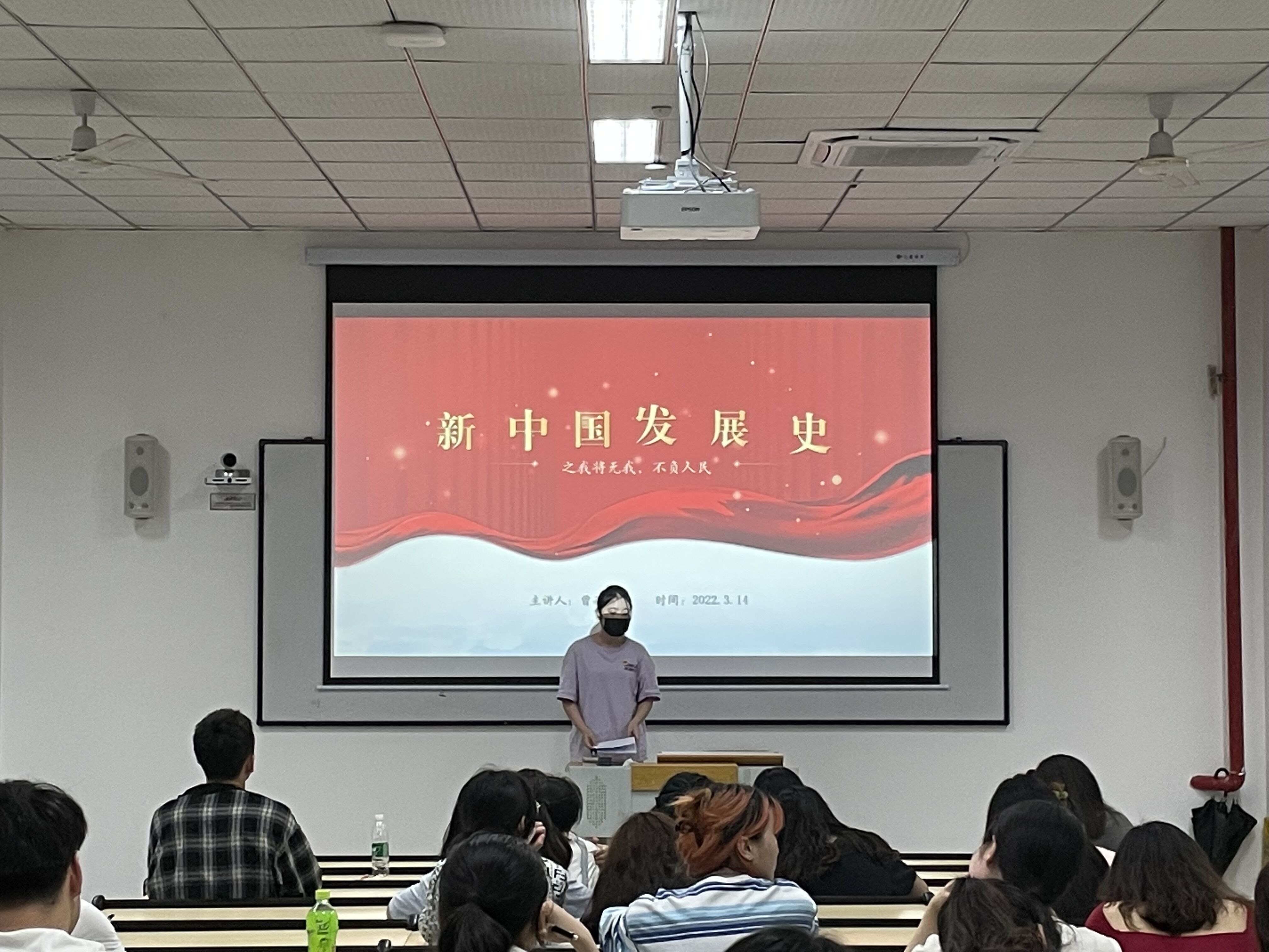 活动开始,冉琦同志为同学们详细地讲解了冬季奥林匹克运动会的发展史,包括其成立的时间、地点、人物和意义。然后,她从7个大项、15个分项、109个小项介绍了2022年北京冬奥会赛事项目。除此,在北京冬奥会中,会徽“冬梦”、吉祥物“冰墩墩”、火炬“飞扬”和跳台滑雪场地“雪如意”等极具中国韵味。奥运健将——挑战自我的谷爱凌、追求卓越的羽生结弦和永不放弃的李玟仪,同学们从他们身上能够深刻地体会到奥林匹克精神。随后,曾莉娟同志从5G时代和举国抗疫两个方面介绍新中国从1949年到2022年的发展史,将新中国的发展历程用71个标志性词语表现出来,呈现出了一幅谋求发展、不懈奋斗的生动画卷。