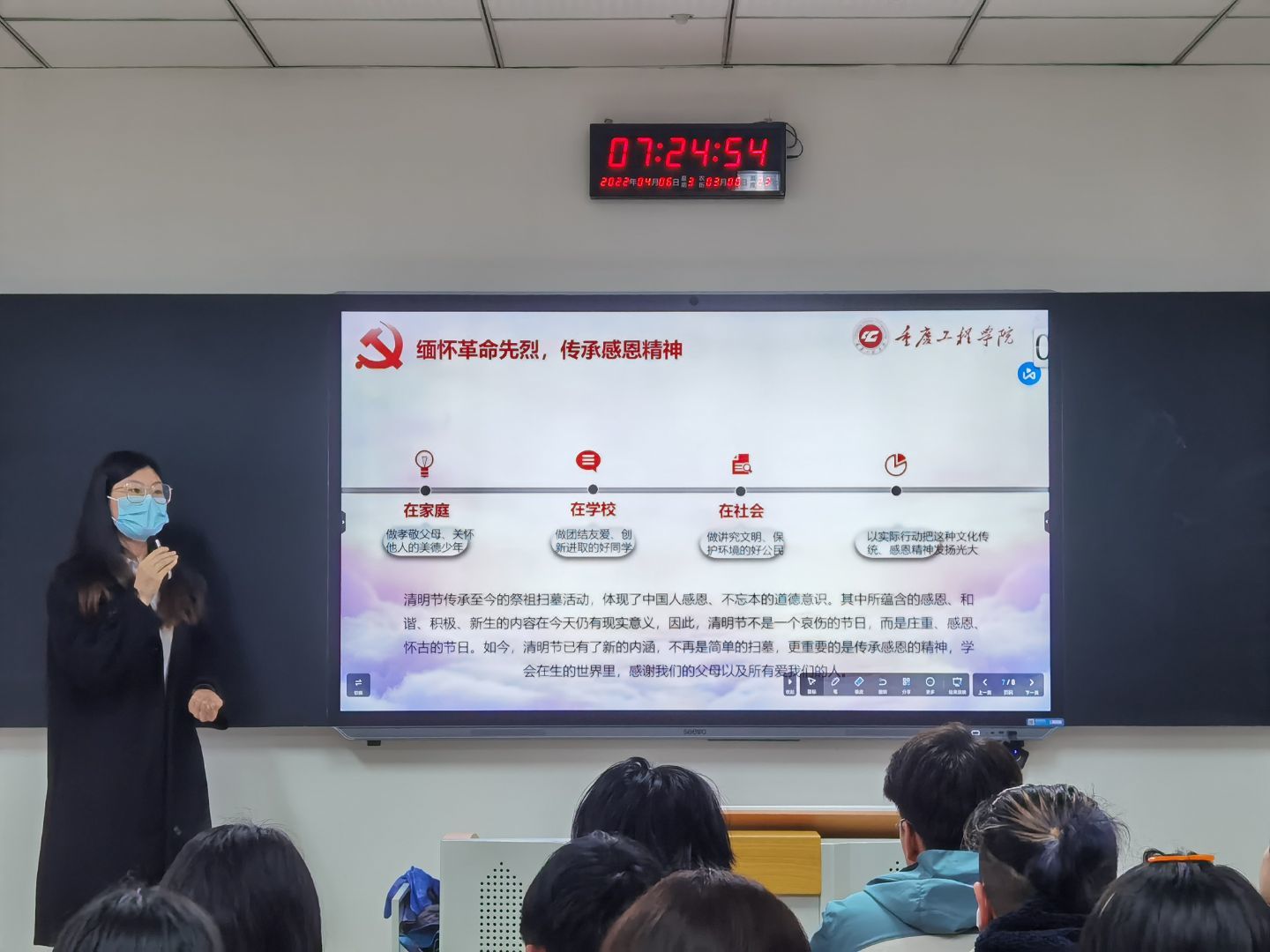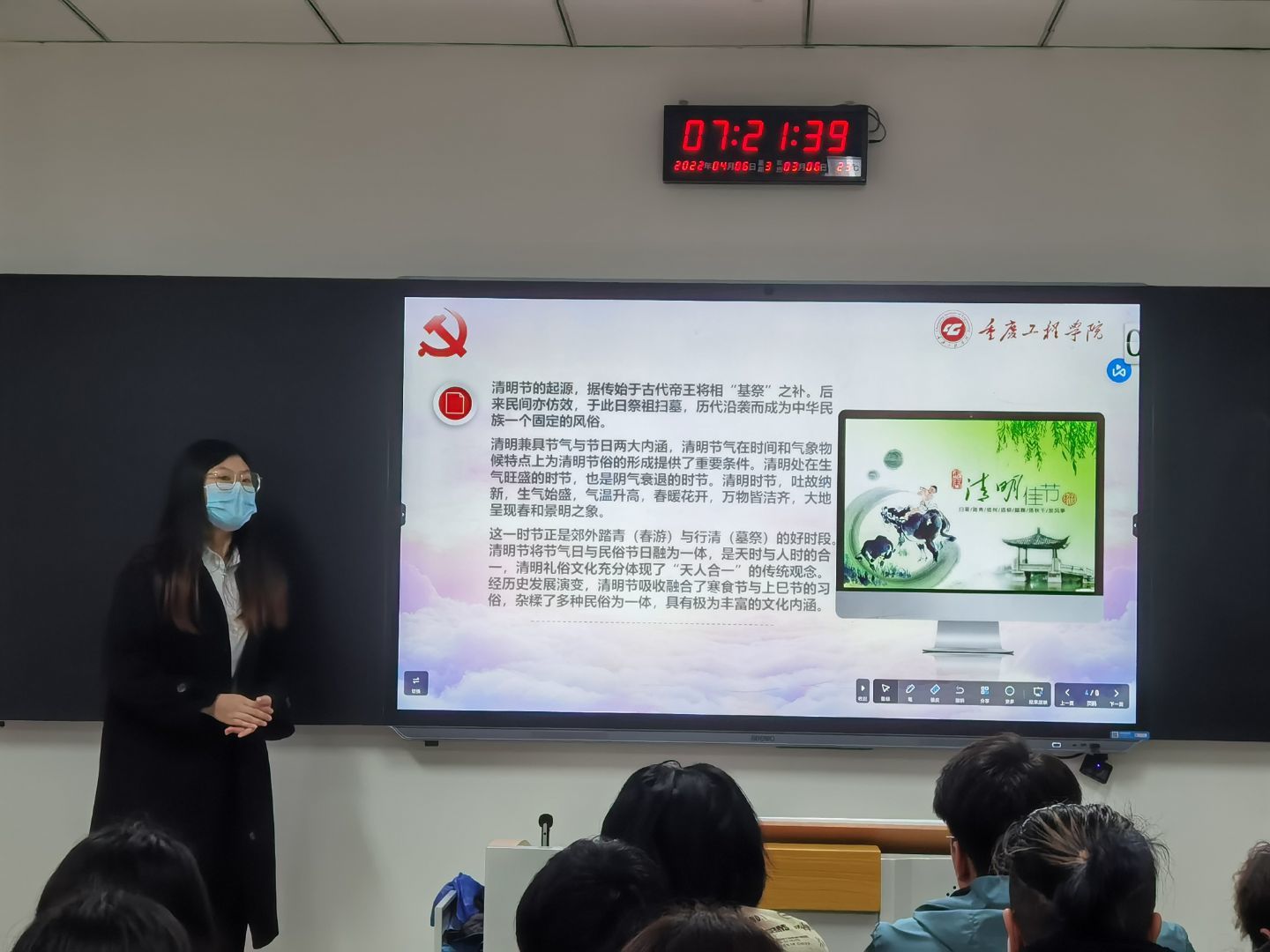 宣讲者们从清明的起源及演变出发,向同学们详细介绍了清明节的历史和习俗;从文明的祭扫方式出发,倡导用献花、植树等方式代替传统的放鞭炮、烧纸钱的习俗,号召同学们做文明祭扫的践行者。宣讲者们带着同学们,一起缅怀和追忆了为国捐躯的革命先烈、在疫情前线牺牲的英雄以及逝去的亲人们,增强了同学们对生命的尊重和对生活的热爱。