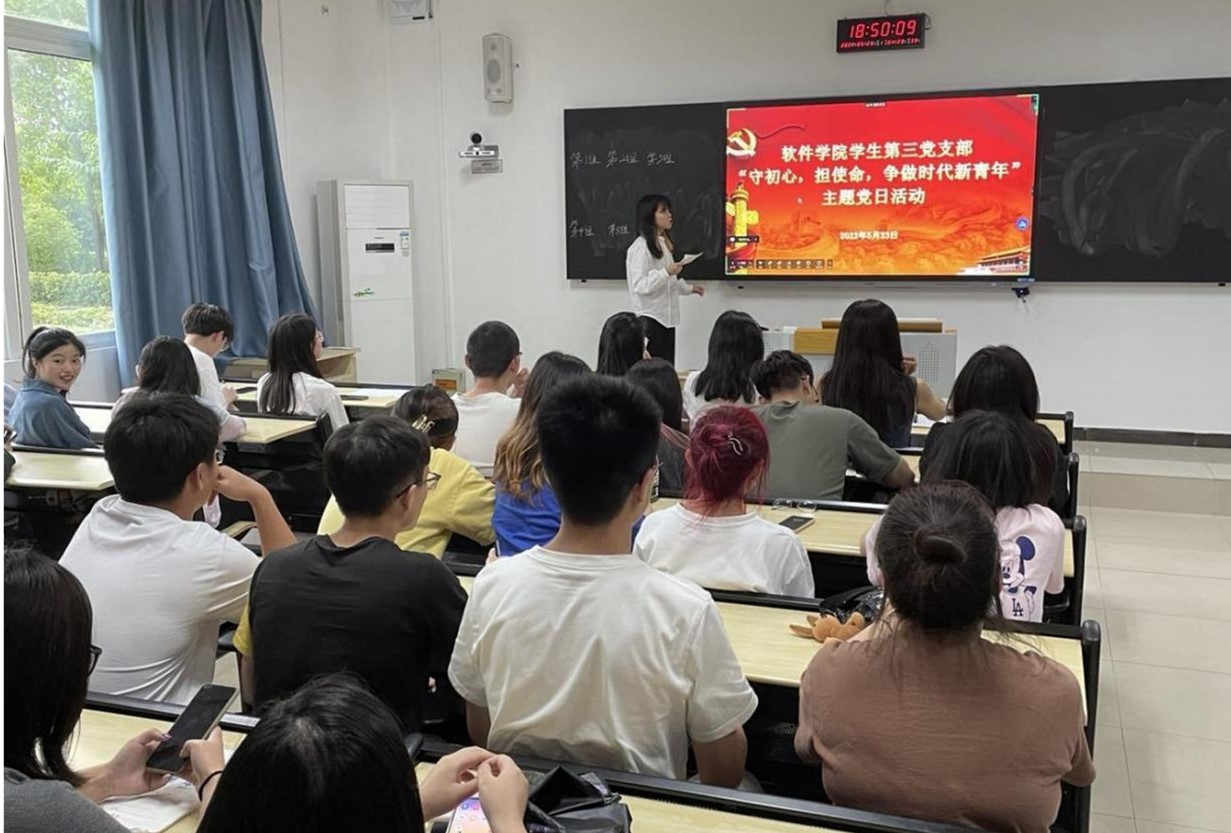 本网讯(文/图 软件学院 熊翊廷)为学习领会习近平总书记对青年学生要“树立远大理想、热爱伟大祖国、担当时代责任、勇于砥砺奋斗、练就过硬本领、锤炼品德修为”的希望,软件学院学生第三党支部于5月23日开展“守初心,担使命,争做时代新青年”党日活动。第三党支部全体在校师生党员和发展对象共同参与了此次活动。