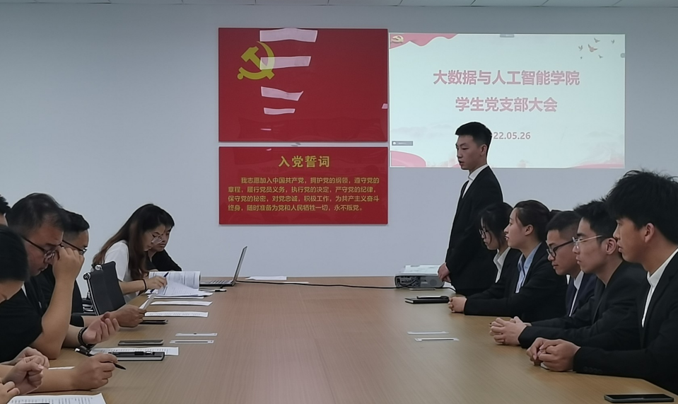 本网讯(大数据与人工智能学院 图/豆段潋 文/张昶)为了进一步壮大学生党员队伍,吸引优秀青年入党,提高支部党员的政治理论水平,践行党员初心使命,2022年5月26日,大数据与人工智能学院学生党支部在7205会议室召开支部党员大会。本次会议由支部书记蔡丽同志主持,支部所有党员线上线下共同参会。