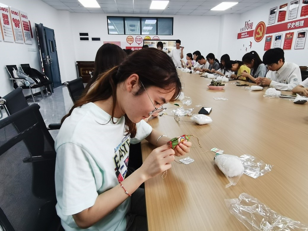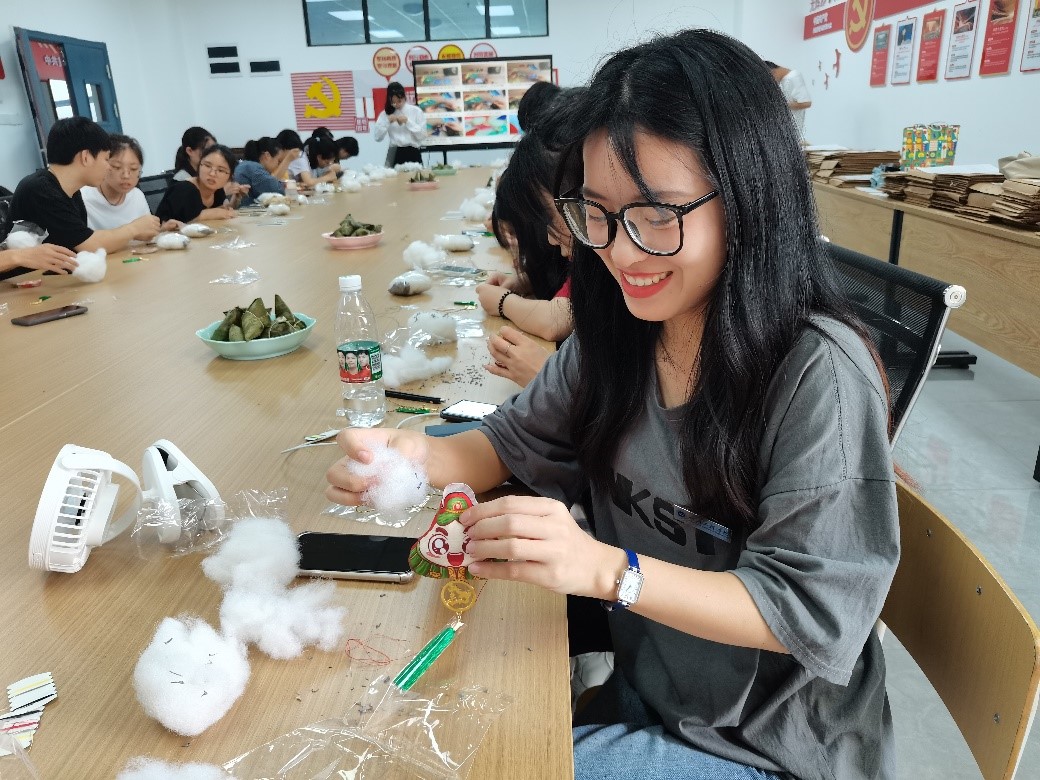 淡淡棕叶香,浓浓世间情,根根丝线连,切切情意牵,端午之际为表达祝福,亲友间互赠香囊的习俗源远流长。本次活动特别邀请了学院新入职的教师参与其中,感受计算机与物联网学院大家庭的温情暖意。彩绳、针线、挂饰等材料一应俱全,同学们和老师们各自挑选了自己喜欢的材料,通过穿五彩线、缝合香囊、填充香料、收口、装饰流苏等步骤,将自己的端午祝福倾注在一针一线里,师生们的欢声笑语和艾草清香交织在一起。最终,小巧精致的手工香囊展现在大家眼前。活动结束后,大家分发粽子,粽子的香气里既是民俗的美味,更是传承千年的文化,浓到化不开的家国情怀。