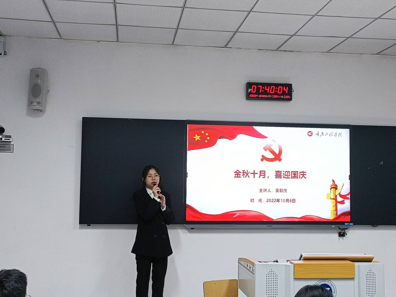 (文/图 管理学院 何金桧)为庆祝新中国成立73周年,以青春担当迎接党的二十大胜利召开,2022年10月6日,管理学院四个学生党支部在第六教学楼开展了“大学生微党课”进班级活动。9名学生预备党员走进晨课教室,向2021级同学们进行了“金秋十月,喜迎国庆”主题宣讲。