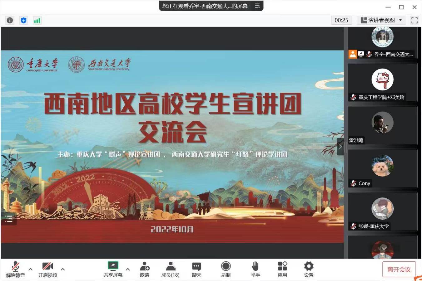 (文/图 软件与人工智能学院 李佳玲)为迎接党的二十大胜利召开,深入学习贯彻习近平新时代中国特色社会主义思想,加强西南地区学生理论宣讲团交流,10月15日,重庆大学“树声”理论宣讲团联合西南交通大学研究生“红路”理论学讲团开展西南地区高校学生宣讲团线上交流活动,我校软件与人工智能学院“云智”宣讲团及电子科技大学、重庆大学等11所高校宣讲团队参与交流。