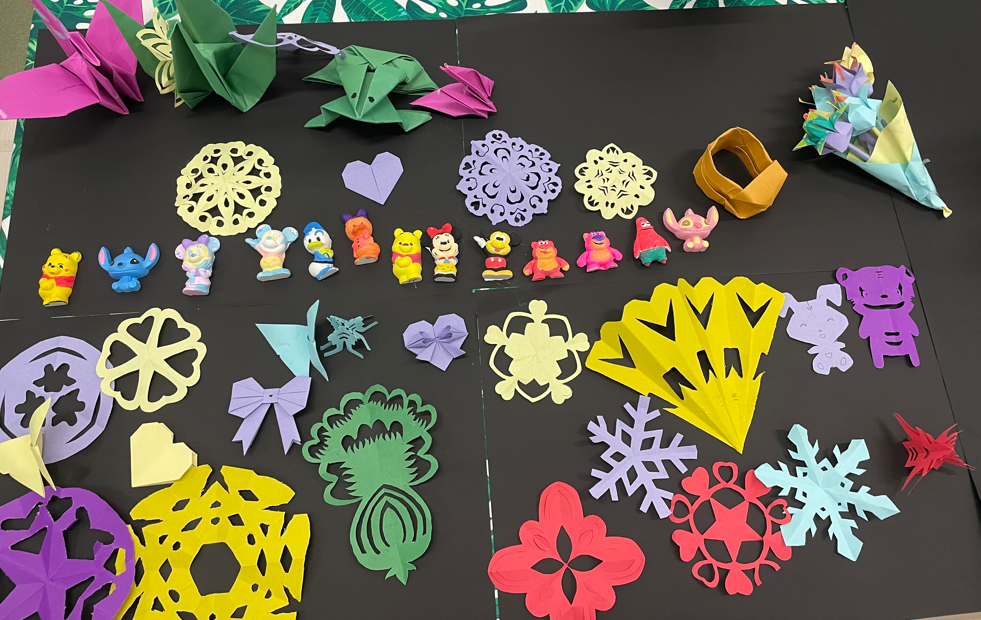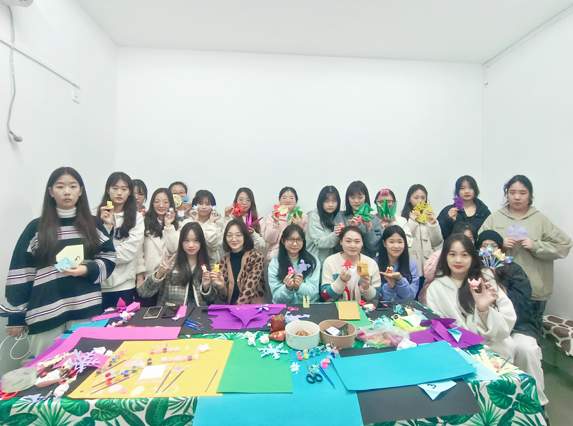活动伊始,同学们通过剪纸、折纸,让鲜艳的彩纸在手中折叠、翻转,将吉祥、希望和祝福融于指尖。紧接着,大家用剪刀裁剪出层叠的窗花、镂空的文字和吉祥的图案等丰富的创意作品。室内方寸之间,同学们热火朝天地忙活着,大家用一把小剪刀细细打磨着自己的作品。在大家的共同努力下,一件件栩栩如生的作品,焕发着别样的风采,饱含着同学们对党和国家的祝福。活动最后,同学们将亲手制作的作品进行了展示、互评,形形色色的作品精巧而富有生活气息,寄托着同学们的美好祝愿。