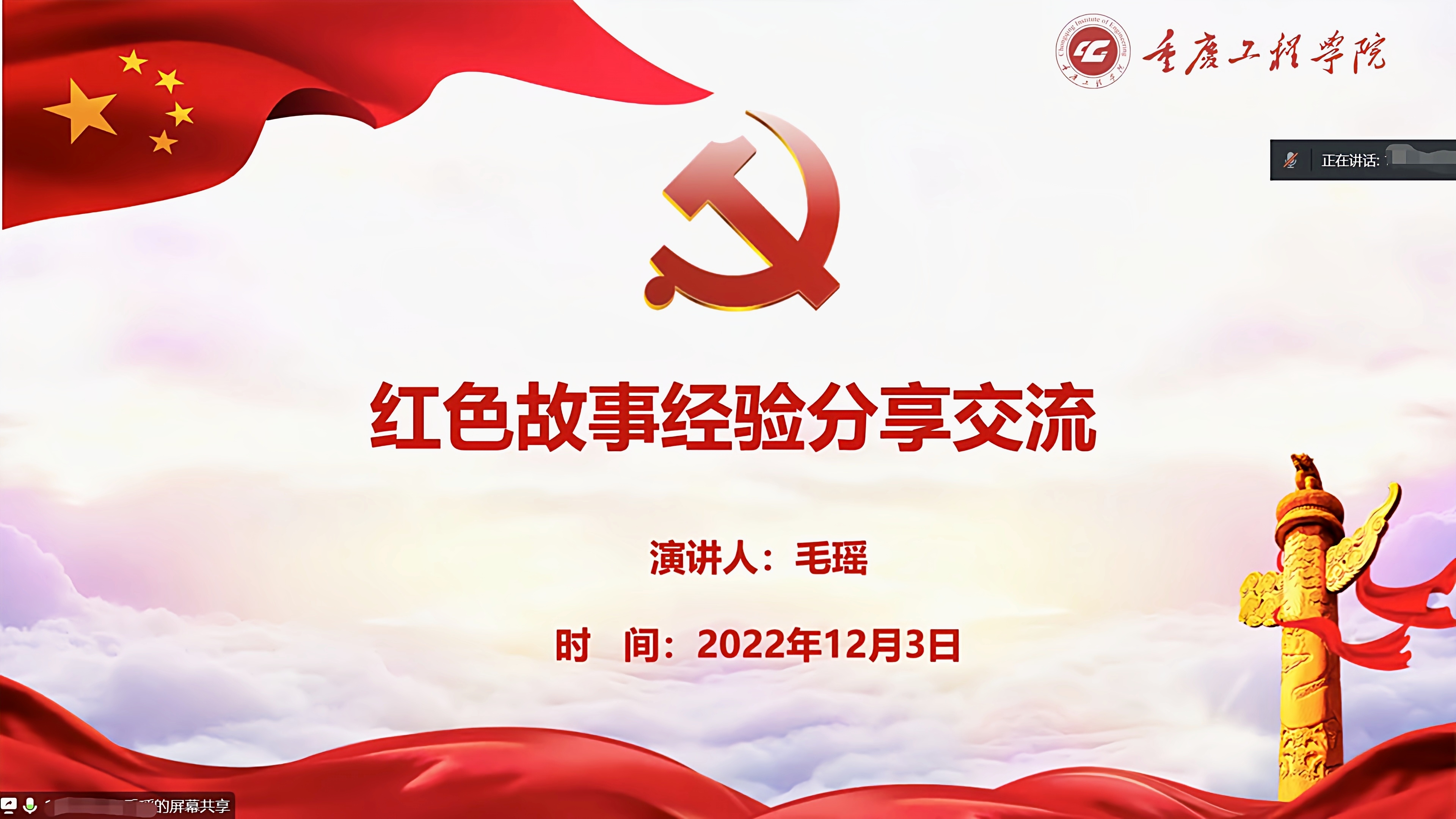 (文/图 管理学院 邹学微)为培养广大青年大学生的民族责任感和历史使命感,践行社会主义核心价值观,增强爱国主义情怀,重庆工程学院青年先锋宣讲团于12月3日开展了“传承红色基因,培育时代新人”线上观影活动。本次活动由宣讲团熊濡同学主持,近120名同学参与。