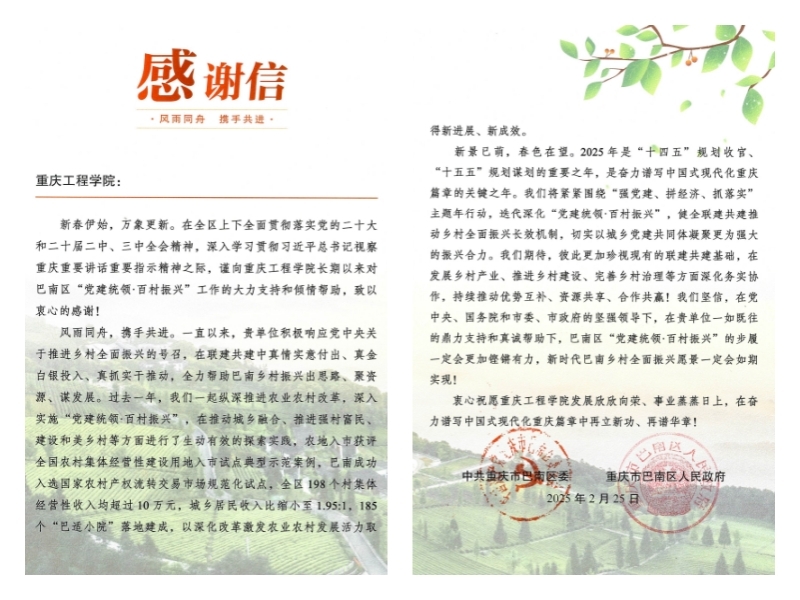 巴南区委、区政府在感谢信中提到,“一直以来,贵单位积极响应党中央关于推进乡村全面振兴的号召,在联建共建中真情实意付出、真金白银投入、真抓实干推动,全力帮助巴南乡村振兴出思路、聚资源、谋发展。过去一年,我们一起纵深推进农业农村改革,深入实施“党建统领·百村振兴”,在推动城乡融合、推进强村富民、建设和美乡村等方面进行了生动有效的探索实践……我们期待,彼此更加珍视现有的联建共建基础,在发展乡村产业、推进乡村建设、完善乡村治理等方面深化务实协作,持续推动优势互补、资源共享、合作共赢!”