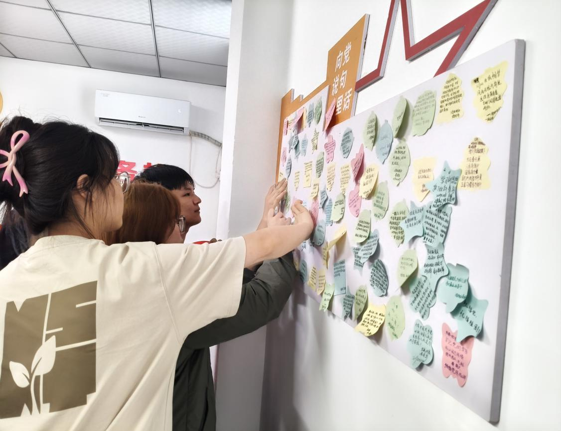 活动开始,参与同学有序领取便利贴与记号笔,神情专注地将对党的赤诚忠心、坚定信仰,以及牢记初心使命的信念诉诸笔端,随后郑重地张贴在留言墙上。在互动分享环节,现场气氛热烈,同学们热情高涨,纷纷走上前分享自己书写的内容与深刻感想,思想的火花不断碰撞。活动中,负责人巧妙引出“匠心筑爱,共绘未来”慧灵心智障碍帮扶感悟分享主题。同学们积极响应,生动讲述在帮扶活动中的难忘经历与满满收获,深刻展现出对“全心全意为人民服务”宗旨的深入理解。