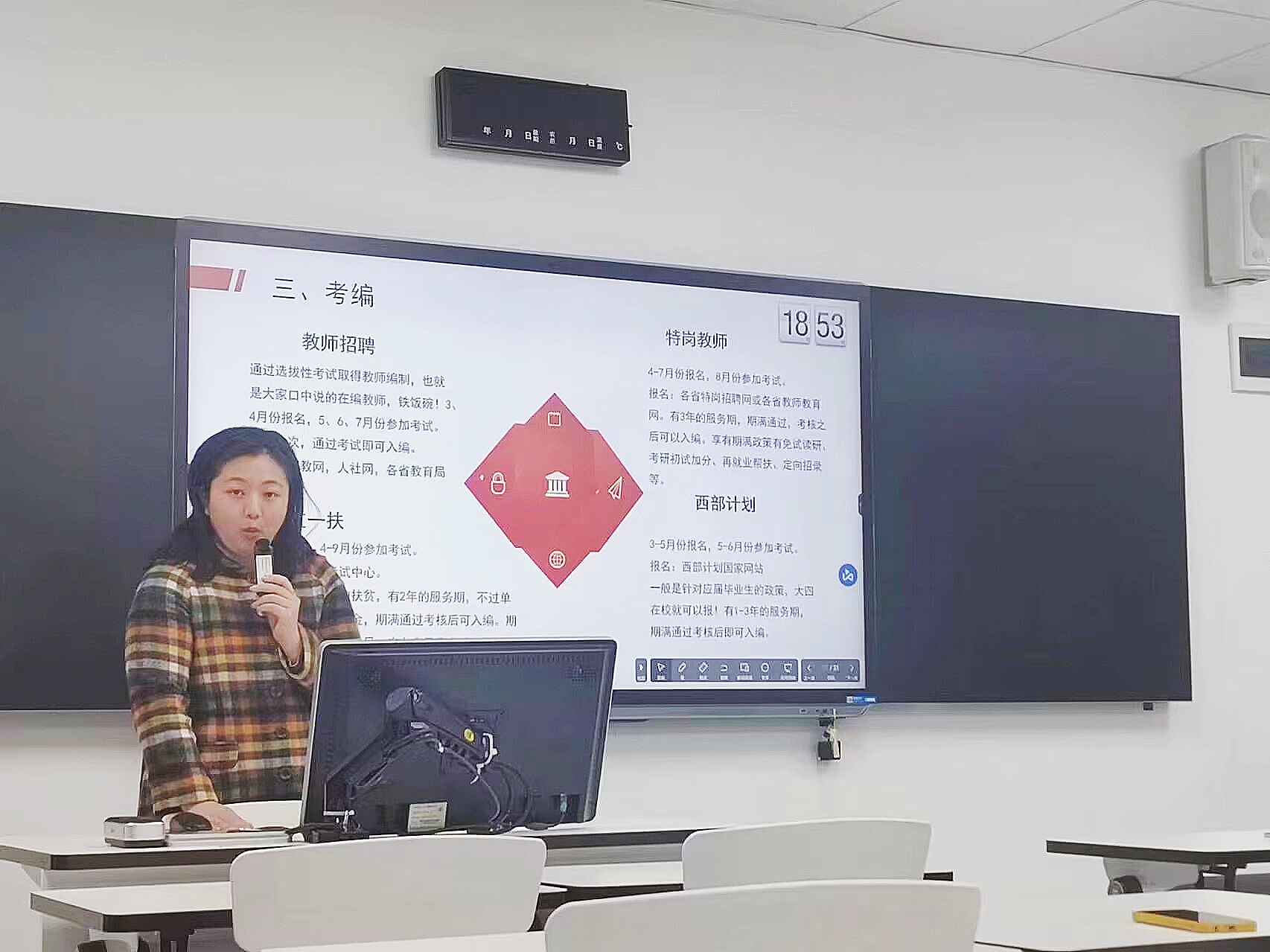 辅导员杨斯琪老师针对考研、考公、考编和就业等学生们普遍关心的问题,进行了详细的解答和建议。她指出,在当前就业市场竞争日益激烈的背景下,提升个人学历和拓宽视野显得尤为重要。杨老师鼓励学生们要根据自身实际情况,制定合适的职业规划,并付诸实践。