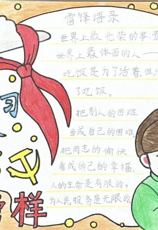 “学习雷锋,好榜样,忠于革命忠于党”,每年的3月5日,我们都会迎来学雷锋日。这个节日源于对一位名叫雷锋的普通士兵的深深敬仰。虽然他只度过了22个春秋,虽然每年的雷锋月只有一个月的时间,但我们对雷锋精神的传承不会止步,但他那种无私奉献、乐于助人、勤奋工作的精神,永远地留在了我们的心中。为了弘扬这种精神,每年的3月,我们会开展形式多样的活动,让雷锋精神在我们的日常生活中生根发芽、茁壮成长。我们相信,只要人人都献出一点爱,世界将变成美好的人间。