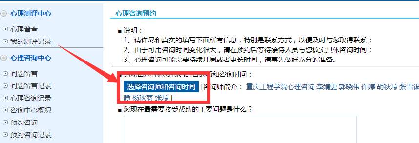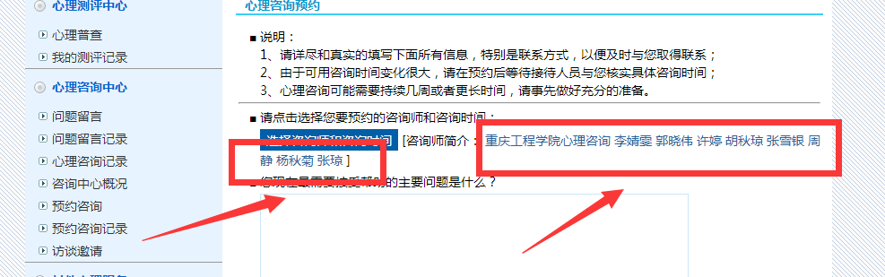 8.点击选择咨询师和咨询时间,会出现咨询师以及对应咨询时间,选取自己方便的时间段进行预约,以免浪费双方时间。网上预约只能提前预约六天以内的咨询,请同学们注意。
