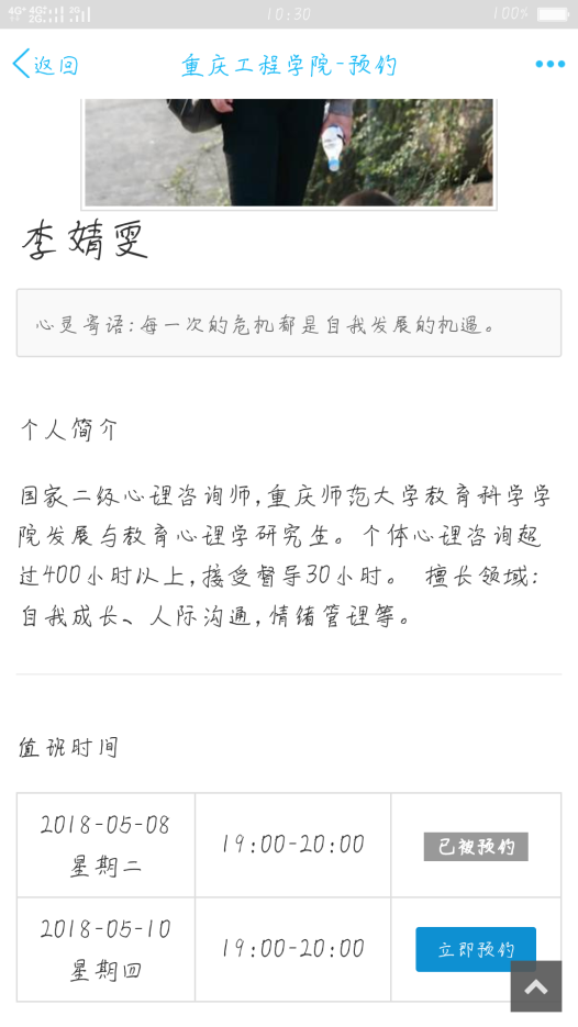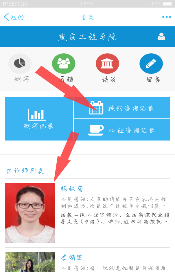 7.点击对应的咨询师姓名,可以查看咨询师简介,选取适合自己的咨询师。