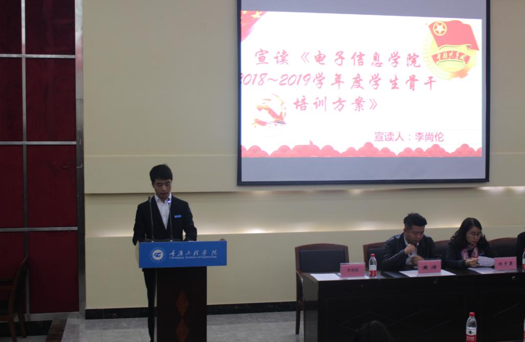 开班仪式上,李尚伦主任宣读了《2018~2019学年度学生会干部及学院各部门学生助理任命决定》及《电子信息学院2018~2019学年度学生骨干培训方案》。学生会主席张源麟同学和学生助理、班委代表皮霜霜同学分别作了发言。