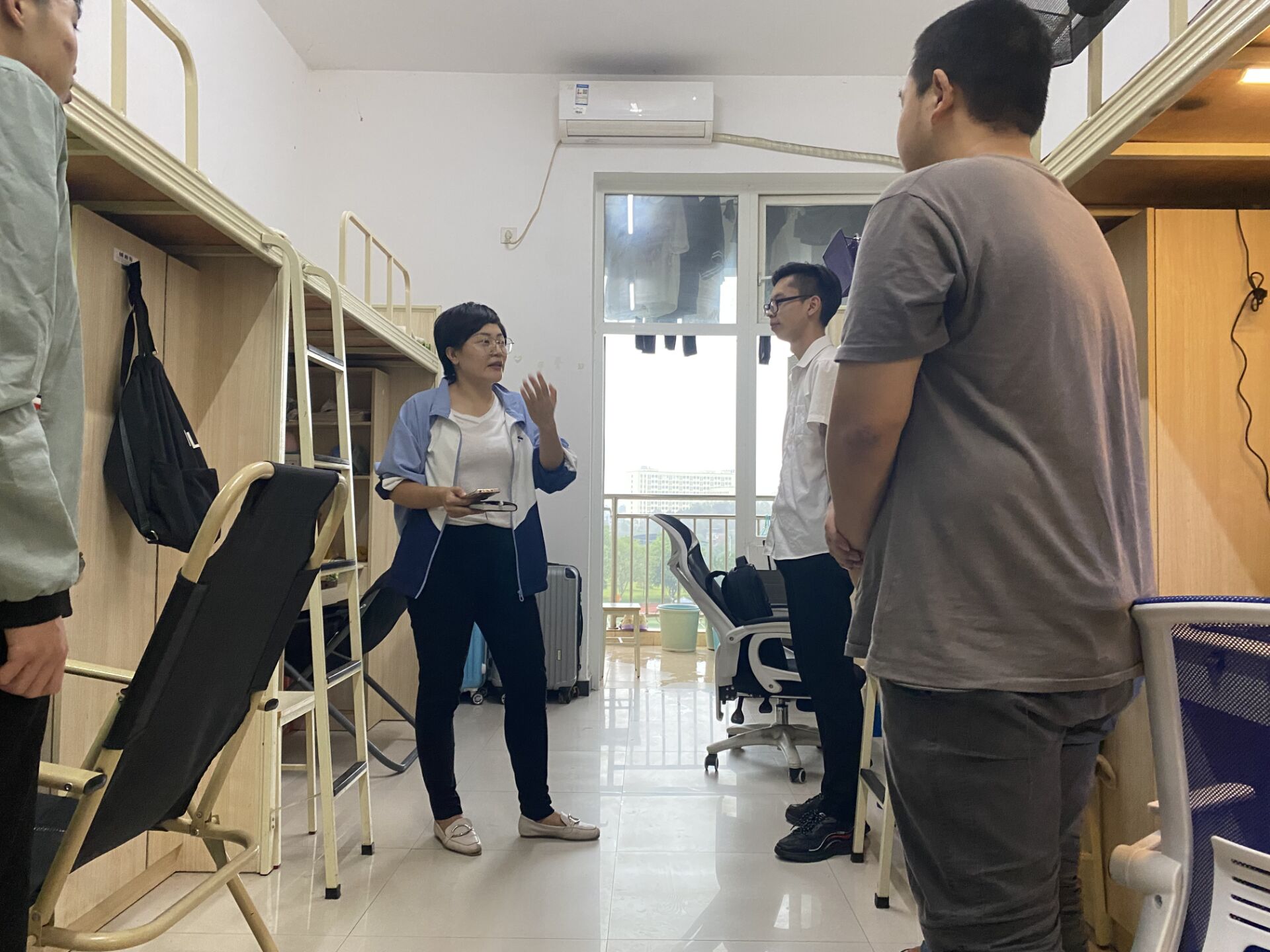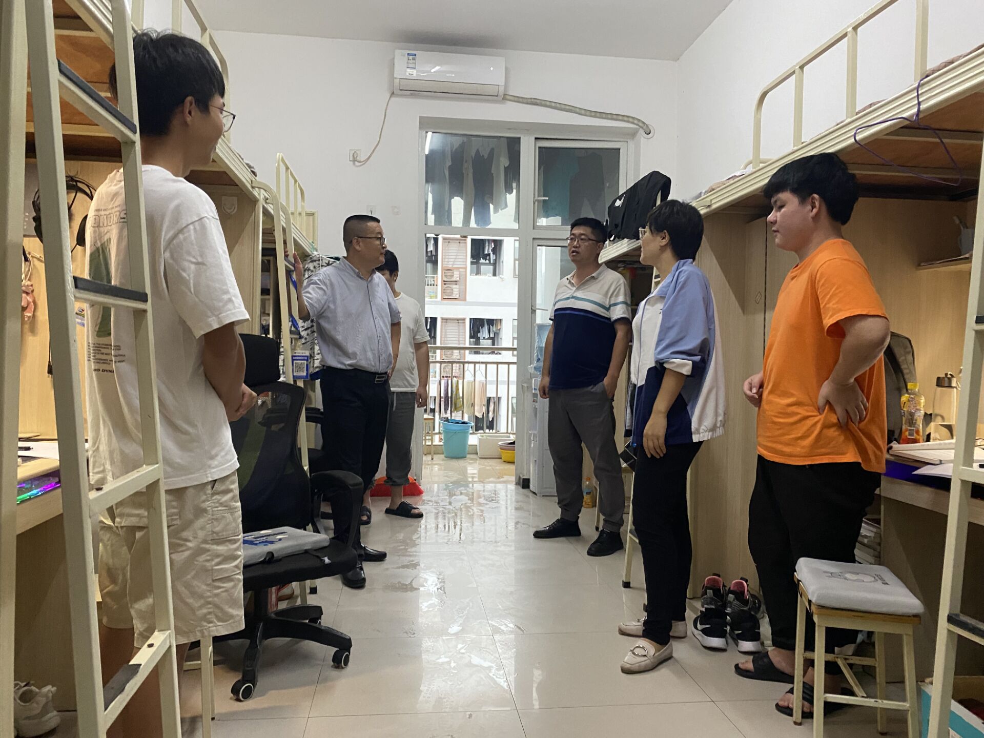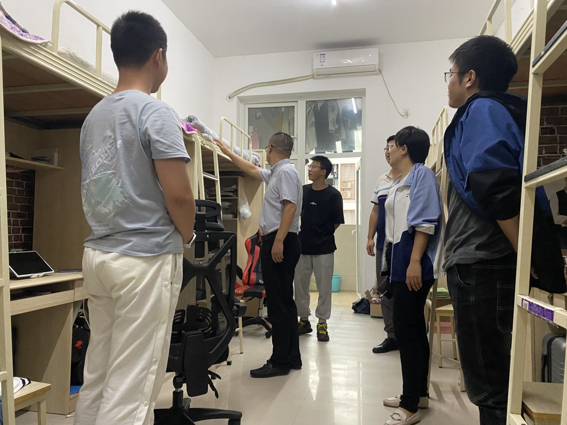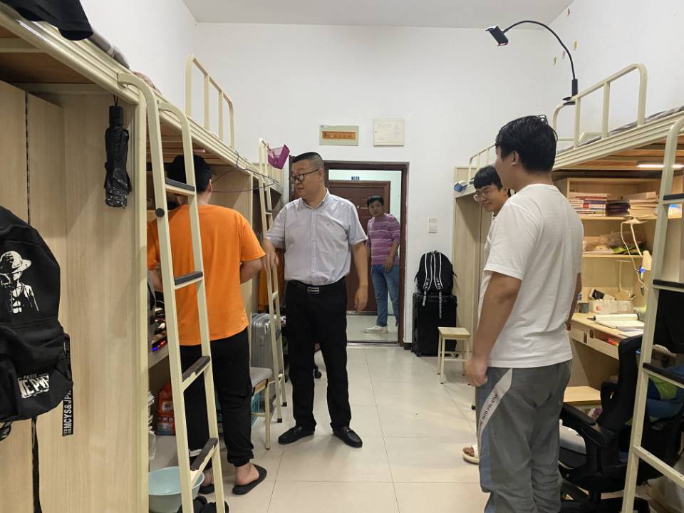 2022年10月5日下午17:00,副校长王建东、学生处处长黄燕、电子信息学院党总支书记谭思宇、学工科长景晖祥与值班辅导员肖璐共同前往和园1号寝室进行随机检查走访。