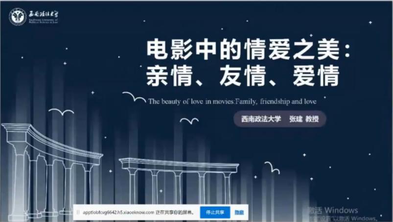 本网讯(图/文 大学生素质教育中心)为进一步加强校园文化建设和大学生素质教育,激发学生对于电影中的情爱之美的了解,11月16日中午,大学生素质教育中心邀请到了西南政法大学新闻传播学院的张建教授通过小鹅通直播平台为全校各专业学生开展题为“电影中的情爱之美:亲情、友情、爱情。”的专题讲座。张教授是博士/博士后,硕导,也是西南政法大学新闻传播学院教授。张教授主要从事网络与新媒体传播、影视艺术理论、传媒美学等研究。发表论文50余篇,出版著作6部,主持结项国家社科基金项目1项,主持省部级项目10余项,获得重庆市社会科学优秀成果奖1项,重庆市社会科学发展研究奖1项等。张教授曾担任国家社科基金同行评议专家,重庆市文旅委广电及网络视听专家评审组成员,重庆市文旅委文化旅游产业专家库专家,重庆广播电视(总台)自制节目评审专家,“挑战杯”全国大学生课外学术科技作品竞赛重庆市选拔赛复赛、决赛评委,重庆市高校教学指导委员会创新创业委员会委员。担任重庆市高教学会美育专委会副理事长,重庆市艺术美学学会支部书记兼副会长,重庆市学校艺术教育协会常务理事。