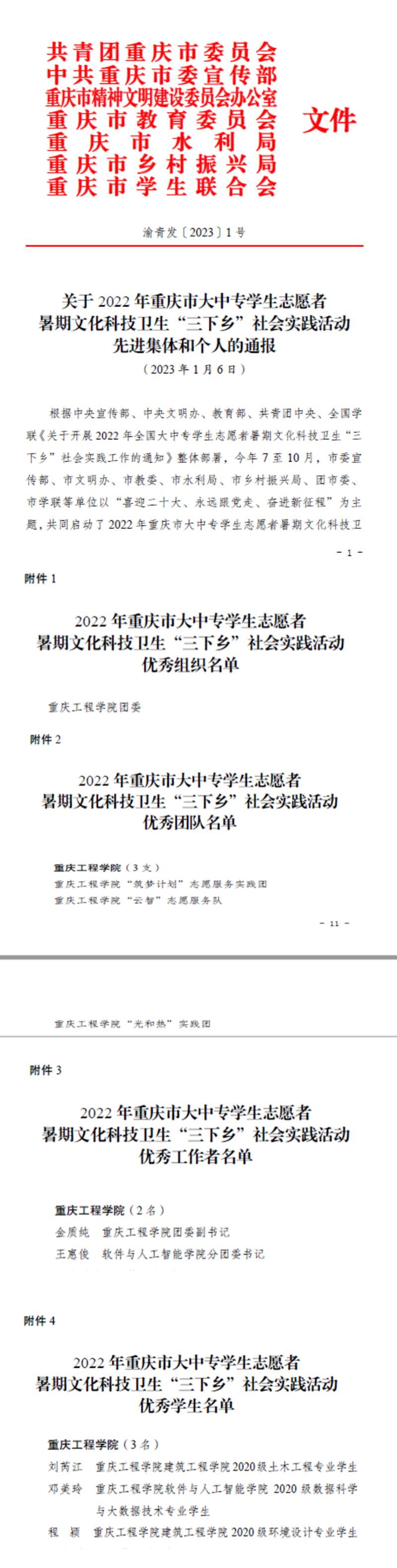 本网讯(文/图 校团委 黄涛)近日,市委宣传部、市文明办、市教委、市水利局、市乡村振兴局、团市委、市学联下发《关于2022年重庆市大中专学生志愿者暑期文化科技卫生“三下乡”社会实践活动先进集体和个人的通报》(渝青发〔2023〕1号),决定对54个优秀组织、202支优秀团队、153名优秀工作者、209名优秀学生进行通报表扬。我校团委连续5年被评为重庆市大中专学生志愿者暑期文化科技卫生“三下乡”社会实践活动优秀组织单位,“筑梦计划”志愿服务实践团、“云智”志愿服务队、“光和热”实践团等3支队伍被评为2022年重庆市大中专学生志愿者暑期文化科技卫生“三下乡”社会实践活动优秀团队;金质纯、王惠俊2位老师被评为2022年重庆市大中专学生志愿者暑期文化科技卫生“三下乡”社会实践活动优秀工作者;刘芮江、邓美玲、程颖3位同学被评为2022年重庆市大中专学生志愿者暑期文化科技卫生“三下乡”社会实践活动优秀学生。