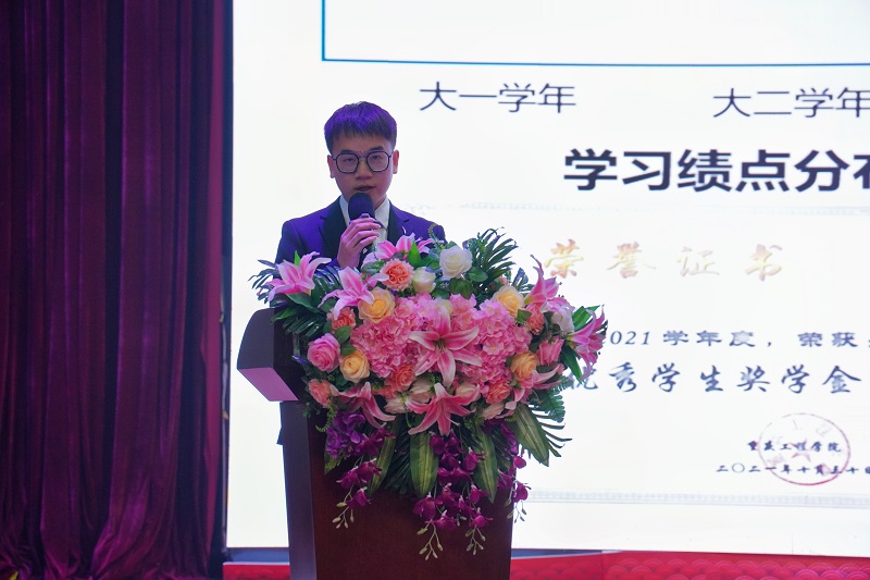 学生戴勇、文梅分别作为国家奖学金获奖代表、重庆市先进个人代表发言,两位同学分享了参加学科专业竞赛、校园文体活动、社会实践活动等的宝贵经历与收获体会,建议同学们重视学科竞赛、积极参与各类活动,在实践中提升经验、增长才干,并号召全体同学勤奋学习、刻苦钻研,以青春智慧和实际行动为实现中国梦贡献自己的力量。