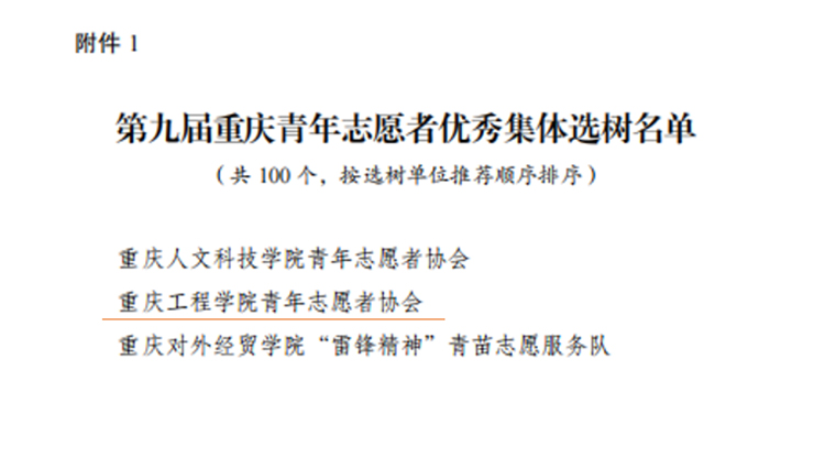 本网讯(图/文 校团委 刘琳靖)为深入学习宣传贯彻党的二十大精神,认真履行好共青团引领青年、组织青年、服务青年的职责使命,大力弘扬“奉献、友爱、互助、进步”的志愿精神,引导广大团员青年培育和践行社会主义核心价值观,重庆市团委决定选树“第九届重庆青年志愿者优秀集体及个人”予以表彰。我校青年志愿者协会及软件与人工智能学院20级高清烨同学,通过层层评选,最终分别荣获“第九届重庆青年志愿者优秀集体”、“第九届重庆青年志愿者优秀个人”荣誉!