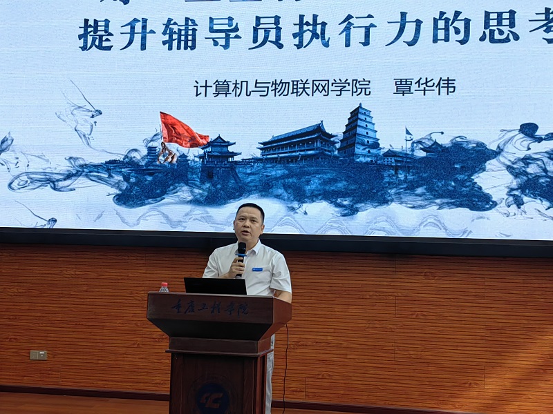 随后,由计算机与物联网学院党总支书记覃华伟带来了“对三全育人背景下提升辅导员执行力的思考”主题分享,覃华伟说道“三全育人”的出发点是培养人、中心在“育”、重心在“全”,三全育人对辅导员的执行能力提出了更高的要求。如何提升辅导员的执行力呢?覃华伟提出,要将执行力划分为理解能力(懂得起)、思考能力(想得到)、协调组织能力(动得了),详细的从这三个能力进行了分析和阐述。