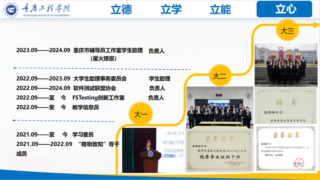 在校期间,荣获国家励志奖学金2次、学校一等优秀学生奖学金3次,大三学年专业排名第一;曾任重庆市辅导员工作室学生助理负责人、软件测试联盟协会负责人、FSTesting工作室负责人等,累计策划组织、工作室活动70余场;积极参加各类学科竞赛,以赛促学,在“挑战杯”“互联网+”“三创”等比赛中斩获佳绩;荣获“三好学生”“创新能力先进个人”“优秀社团学生干部”等荣誉称号,累计荣获国家级、省市级、校院级荣誉证书60余项;考取国家级职能证书2项,发表学术论文4篇,授权软件著作权5项,发明专利等2项,主持国家级、省部级、校级大创项目4项并成功结项2项。