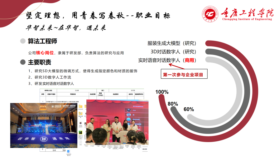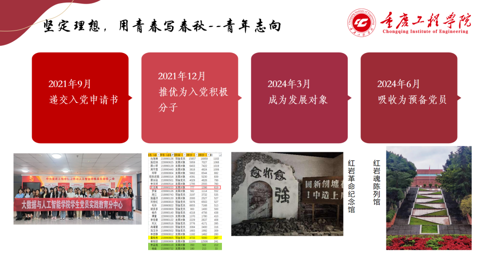 生在红旗下,长在春风里,那颗赤诚之心在五星红旗的包裹下,跳动着奔向梦想的旋律,从20219月递交入党申请书起,到20246月成为预备党员,他的每一步成长都深深镌刻着对党的无限忠诚与坚定信仰。成为一名高水平的人工智能工程师,是他一直的梦想。现任华智未来核心岗位算法工程师,担任起研发商用项目实时语音对话数字人的重任。成为一名优秀的重工学子,是他大学四年的目标。在校期间的每一项荣誉都是他努力的足迹。