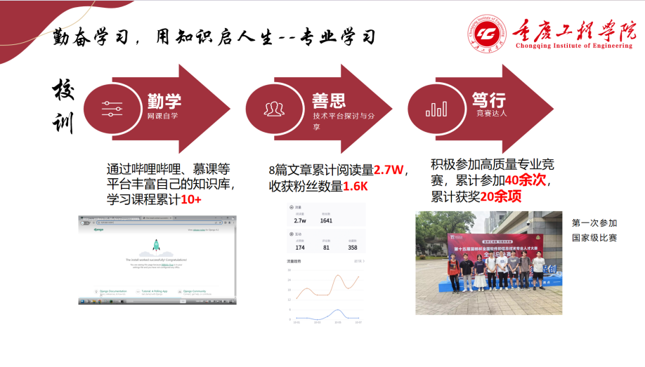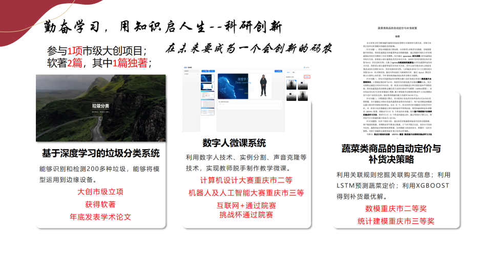 其在校期间,他学习成绩优异,荣获优秀学生奖学金3次,其中一等优秀奖学金两次;曾担任班级晨课助理、大学生助理事务委员会学生助理、人工智能创新工作室负责人等,累计组织和参与助理团、工作室活动40余场,带领工作室成员累计荣获20余项荣誉;荣获重庆工程学院“三好学生”、重庆工程学院优秀共青团员、重庆工程学院优秀学生社团会员等荣誉称号,累计荣获国家级、省市级、校级荣誉证书40余项;授权软件著作权2项,其中独著1项;申请市级大学生创新创业训练计划等1项。