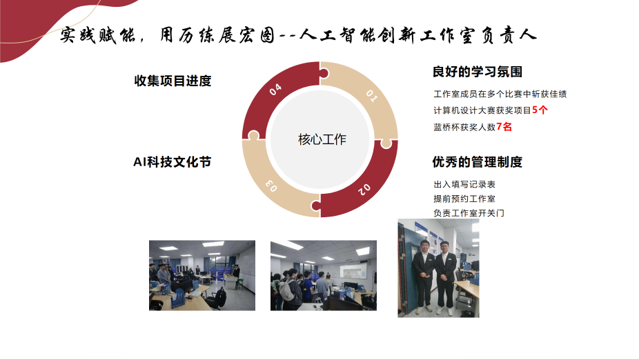 作为大学生助理事务委员会学生助理,积极投身团队建设之中。以满腔热情履行职责,在2023年荣获“工作积极先进个人”称号。也担任人工智能创新工作室的负责人,推动项目进展,营造良好学习氛围。本学年,工作室在计算机设计大赛中斩获5项大奖,蓝桥杯获奖人数达7名。在志愿服务领域,秉持无私奉献的精神,将爱心与热情融入每一次志愿服务中,累计志愿服务学时超180个。
