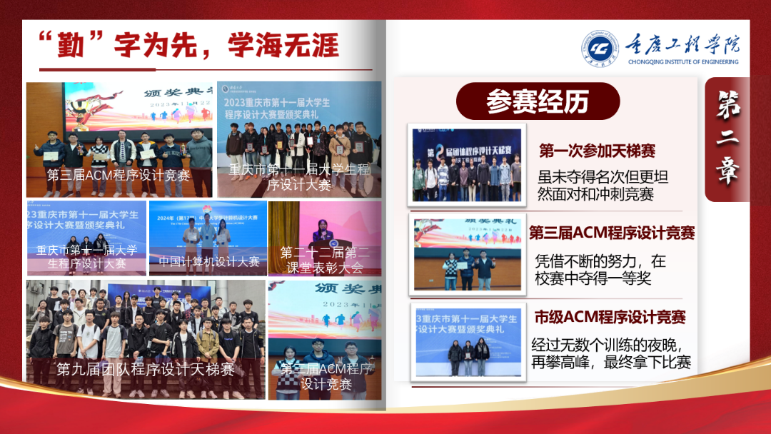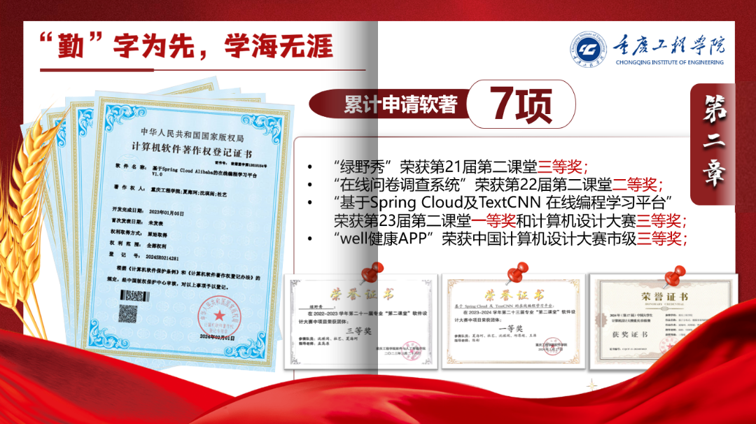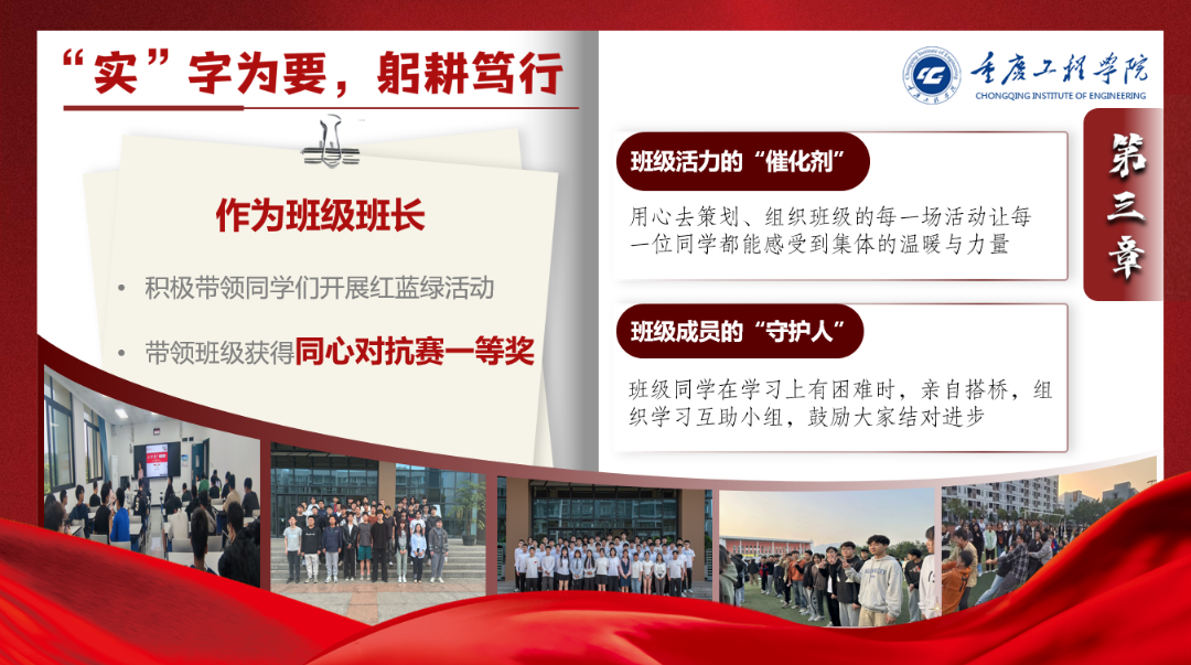 人生如书,卷卷长,执笔绘章,熠熠光,每个人的青春都是一本书,作为重庆工程学院软件学院21软工2班的一员,她用四年的时光书写了一部以“信、勤、实”为主线的青春之作。