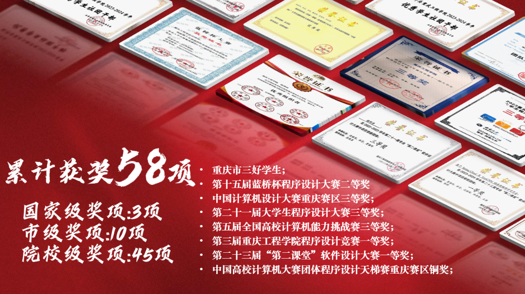 在校期间,荣获一等优秀学生奖学金2次,通过英语六级;曾担任ACM社团负责人、班级班长等职务;担任社团负责人期间,累计策划组织校内活动和竞赛训练百余场,带领ACM社团连续三年荣获优秀学生社团荣誉称号,并在2023年带领社团荣获重庆市高校“一校一社”优秀(十佳)社团称号;荣获“重庆市三好学生”“创新能力先进个人”“精神文明先进个人”等荣誉称号;积极参加各类专业竞赛,将所学的知识运用于实践,在“蓝桥杯”“天梯赛”“程序设计竞赛”中屡屡获奖,累计荣获国家级、省市级、校级荣誉证书50余项,申请软著7篇。