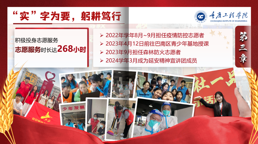 在志愿服务中,她用脚步丈量初心。从疫情防控一线,到延安精神宣讲团,她累计志愿服务时长达268小时。无论是在课堂上传递知识,还是在社会实践中奉献力量,她都用实际行动书写了责任与担当的篇章。