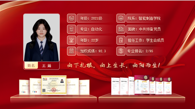 知行合一,以知促行,以行求知。在大学期间,她担任过班委、学生助理、学院学生会成员,从多方面锻炼自己,提升综合能力。同时作为新学院工作室的初创成员,和她的团队伙伴们在指导老师的共同努力下一起成立了“机器人与智控创新中心”,搭建交流平台,让未来的重工学子再创佳绩。她在学生会工作付出中感受到幸福与价值所在。秉持着为学院奉献、为老师同学服务的初心,在任期间组织活动30余场,参与人数超1000人次。